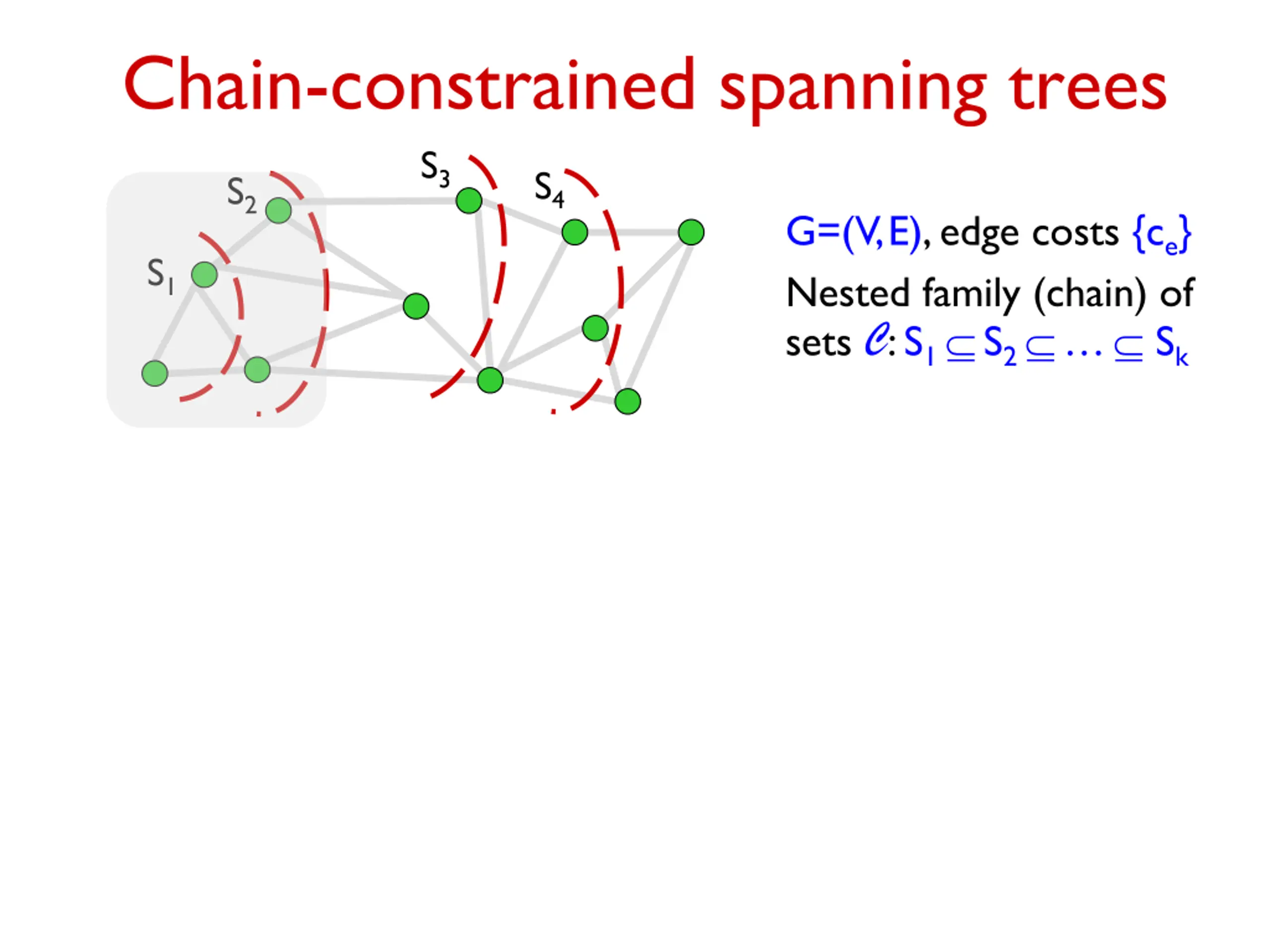 Chain-constrained spanning trees S3 S4 S2 G=(V,E), edge costs {ce} Nested family (chain) of sets : S1 S2 Sk S1