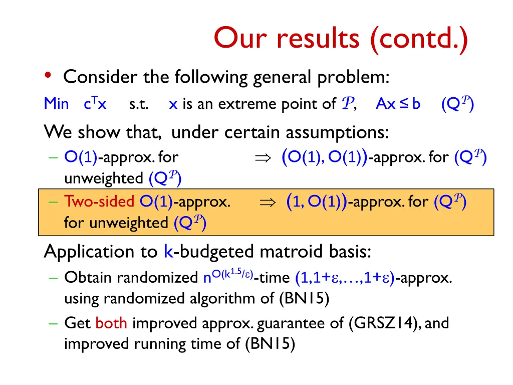Our results (contd.) Consider the following general problem: Min cTx s.t. x is an extreme point of P, Ax b We show that, under certain assumptions: O(1)-approx. for unweighted (QP) Two-sided O(1)-approx. for unweighted (QP) Application to k-budgeted matroid basis: Obtain randomized nO(k1.5/ )-time (1,1+ , ,1+ )-approx. using randomized algorithm of (BN15) Get both improved approx. guarantee of (GRSZ14), and improved running time of (BN15) (QP) (O(1), O(1))-approx. for (QP) (1, O(1))-approx. for (QP)