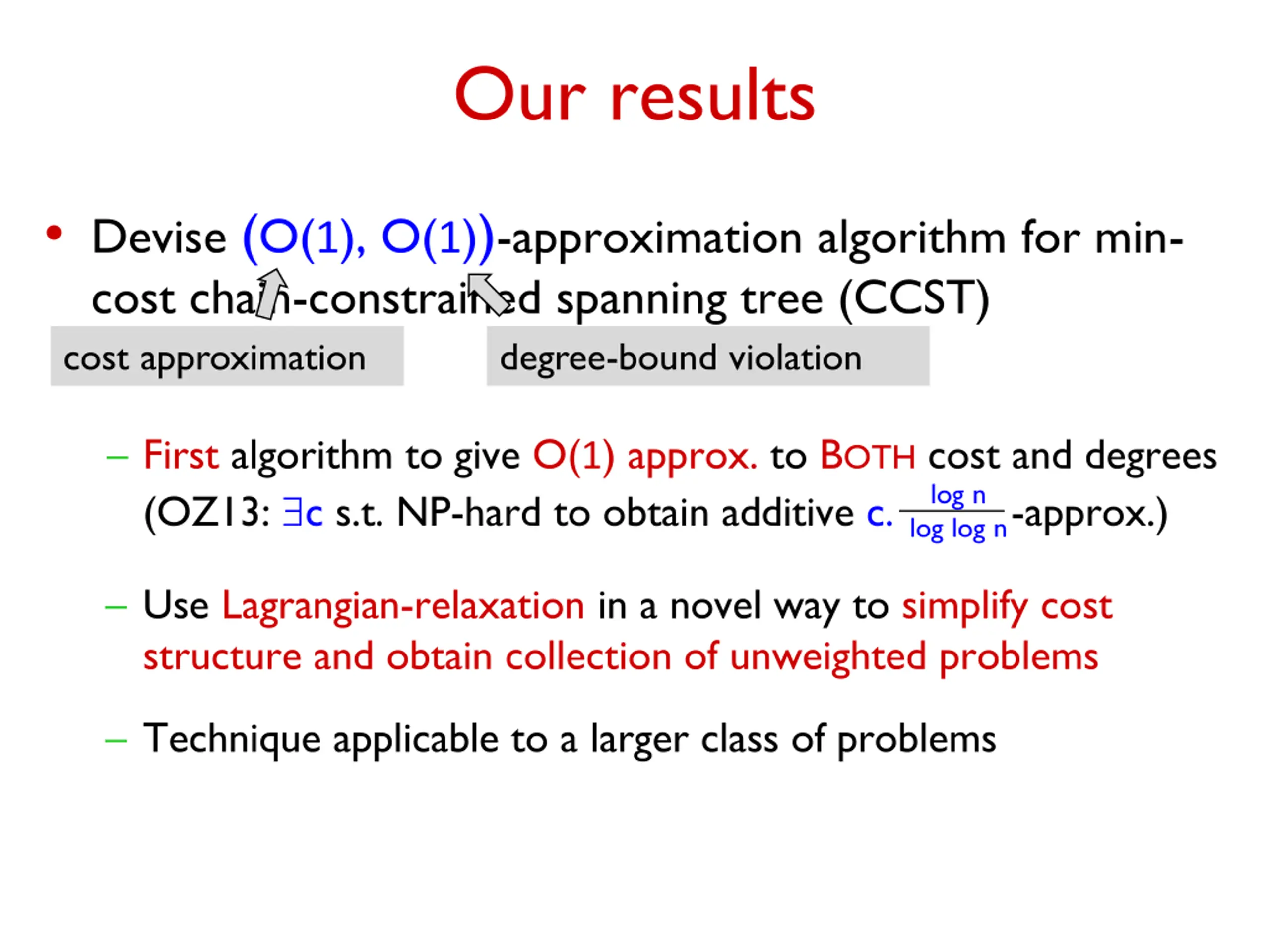 Our results Devise (O(1), O(1))-approximation algorithm for min- cost chain-constrained spanning tree (CCST) cost approximation degree-bound violation First algorithm to give O(1) approx. to BOTH cost and degrees (OZ13: c s.t. NP-hard to obtain additive c. log n log log n -approx.) Use Lagrangian-relaxation in a novel way to simplify cost structure and obtain collection of unweighted problems Technique applicable to a larger class of problems