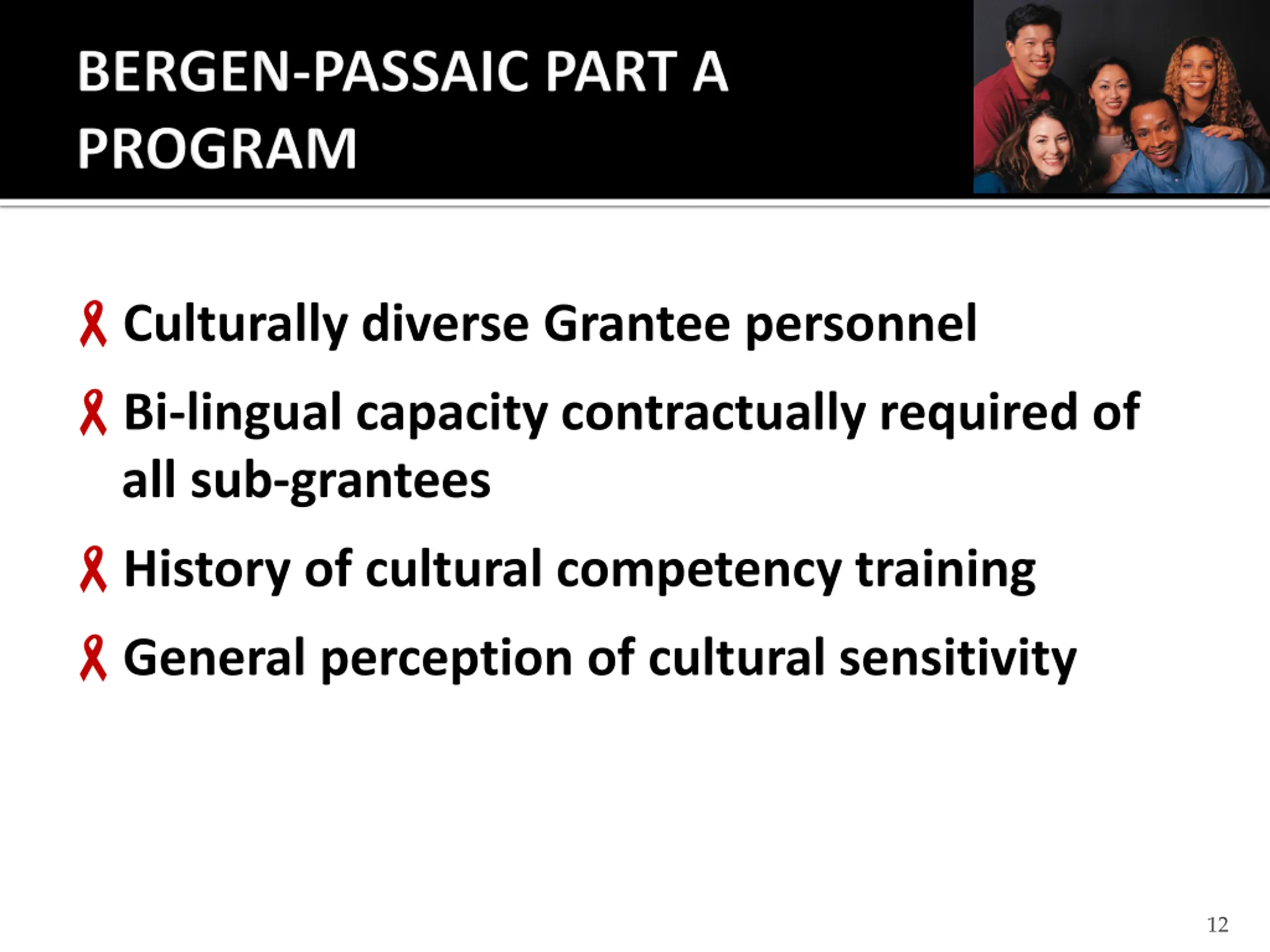 15 Ryan White Part A providers, four Minority AIDS Initiative (MAI) providers, and six HOPWA providers. Culturally diverse Grantee personnel Bi-lingual capacity contractually required of all sub-grantees History of cultural competency training General perception of cultural sensitivity 12