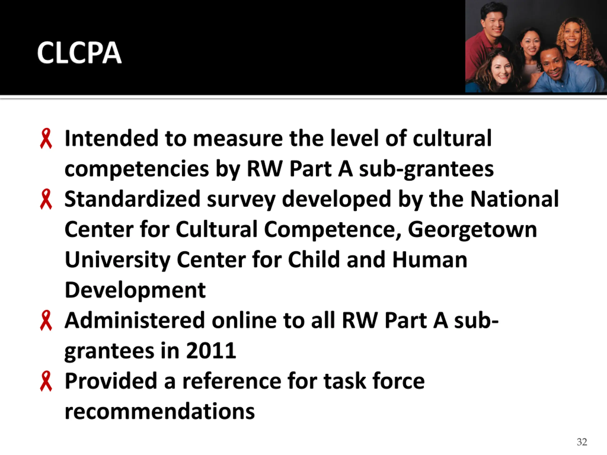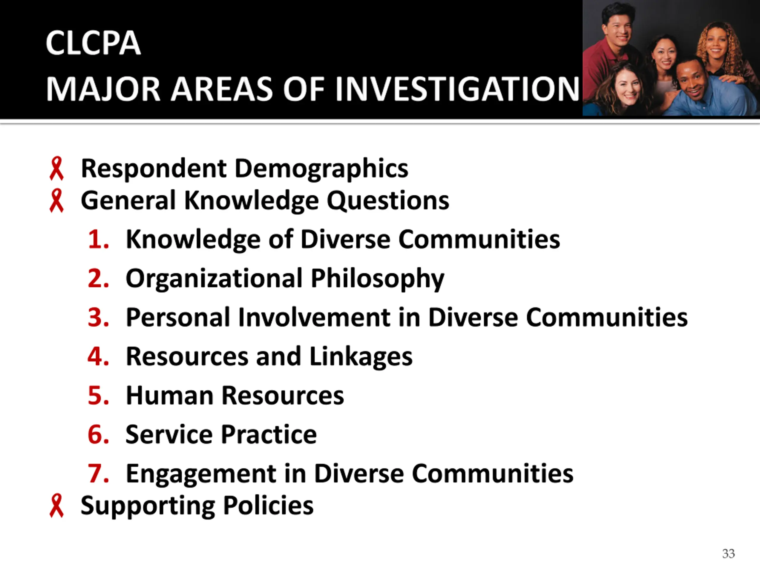 15 Ryan White Part A providers, four Minority AIDS Initiative (MAI) providers, and six HOPWA providers. Intended to measure the level of cultural competencies by RW Part A sub-grantees Standardized survey developed by the National Center for Cultural Competence, Georgetown University Center for Child and Human Development Administered online to all RW Part A sub- grantees in 2011 Provided a reference for task force recommendations 32