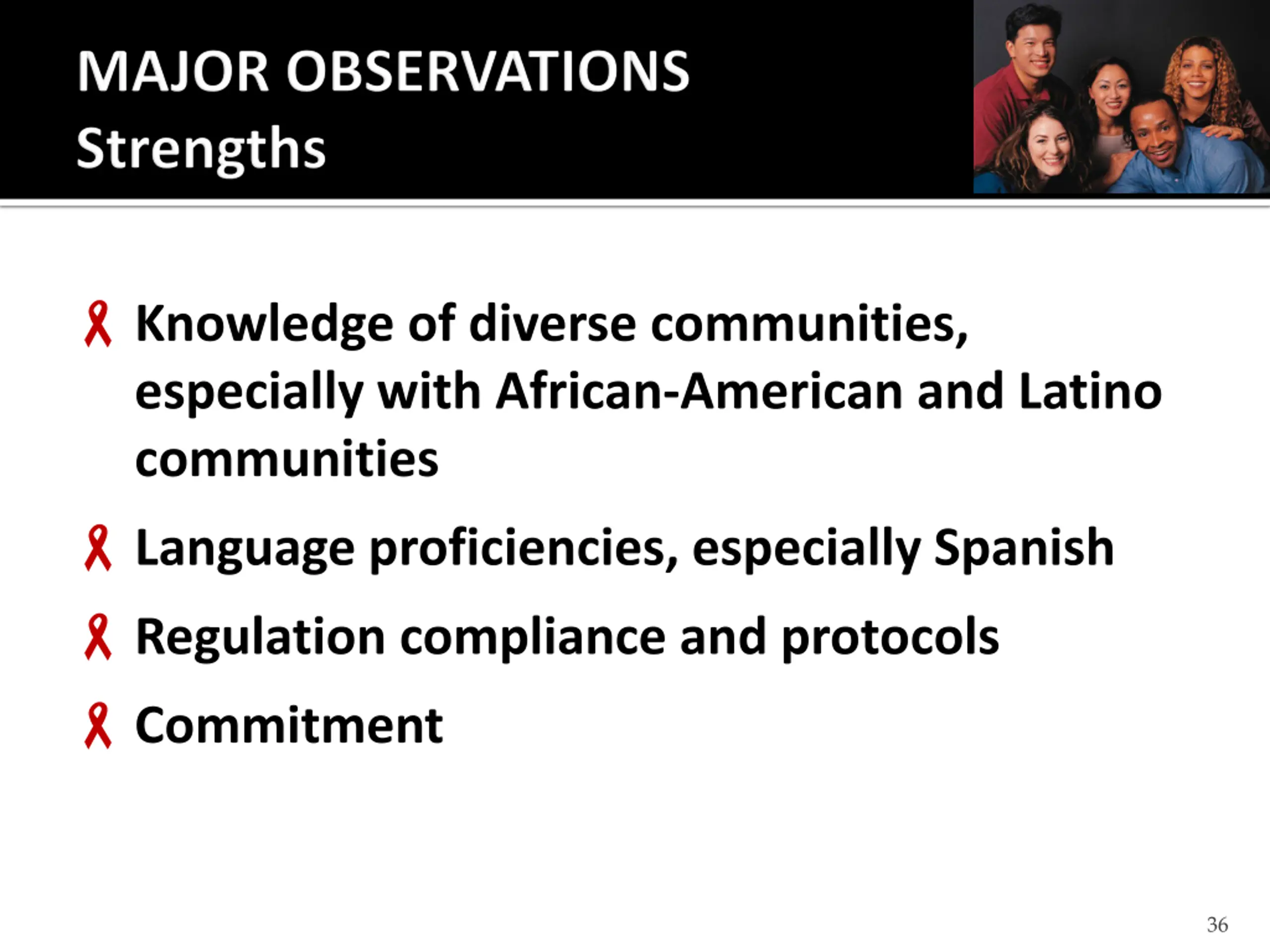 15 Ryan White Part A providers, four Minority AIDS Initiative (MAI) providers, and six HOPWA providers. Knowledge of diverse communities, especially with African-American and Latino communities Language proficiencies, especially Spanish Regulation compliance and protocols Commitment 36