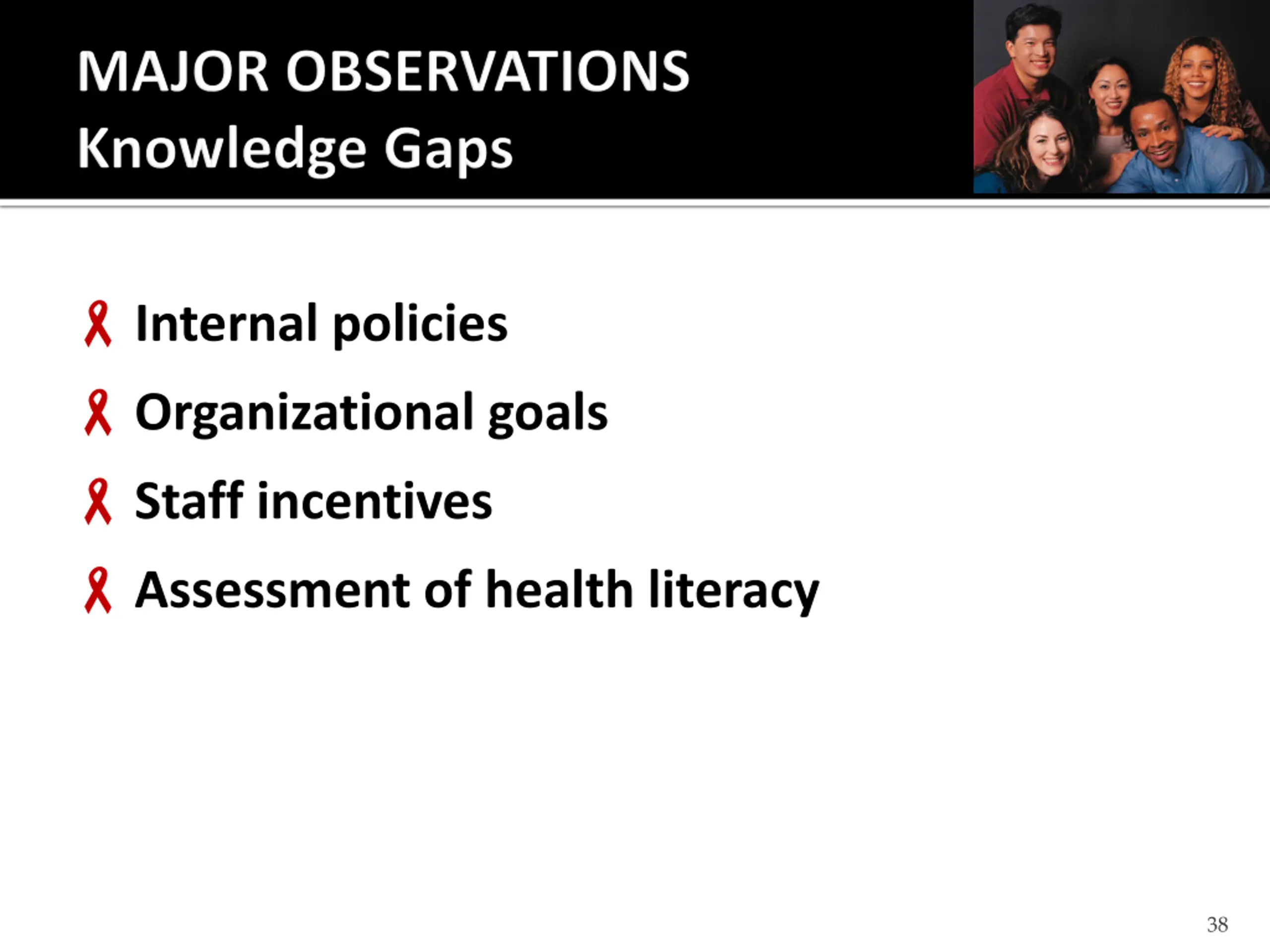 15 Ryan White Part A providers, four Minority AIDS Initiative (MAI) providers, and six HOPWA providers. Internal policies Organizational goals Staff incentives Assessment of health literacy 38