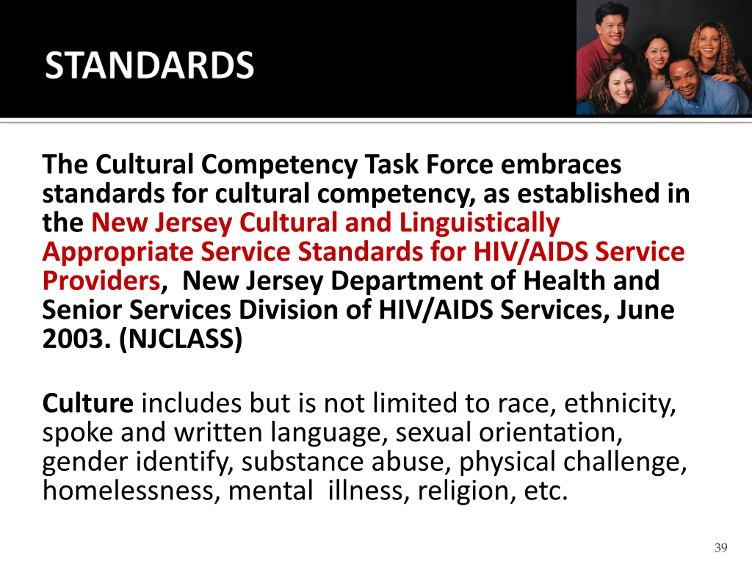 15 Ryan White Part A providers, four Minority AIDS Initiative (MAI) providers, and six HOPWA providers. The Cultural Competency Task Force embraces standards for cultural competency, as established in the New Jersey Cultural and Linguistically Appropriate Service Standards for HIV/AIDS Service Providers, New Jersey Department of Health and Senior Services Division of HIV/AIDS Services, June 2003. (NJCLASS) Culture includesbut is not limited to race, ethnicity, spoke and written language, sexual orientation, gender identify, substance abuse, physical challenge, homelessness, mental illness, religion, etc. 39
