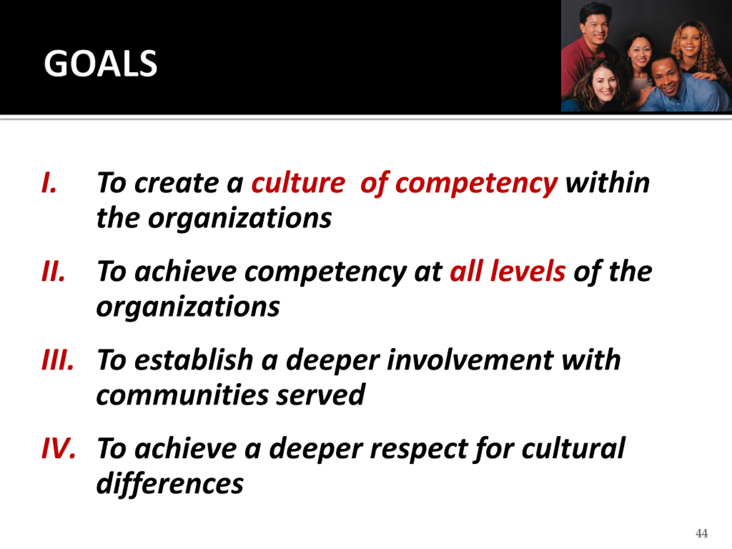 15 Ryan White Part A providers, four Minority AIDS Initiative (MAI) providers, and six HOPWA providers. I. To create a culture of competency within the organizations II. To achieve competency at all levels of the organizations III. To establish a deeper involvement with communities served IV. To achieve a deeper respect for cultural differences 44