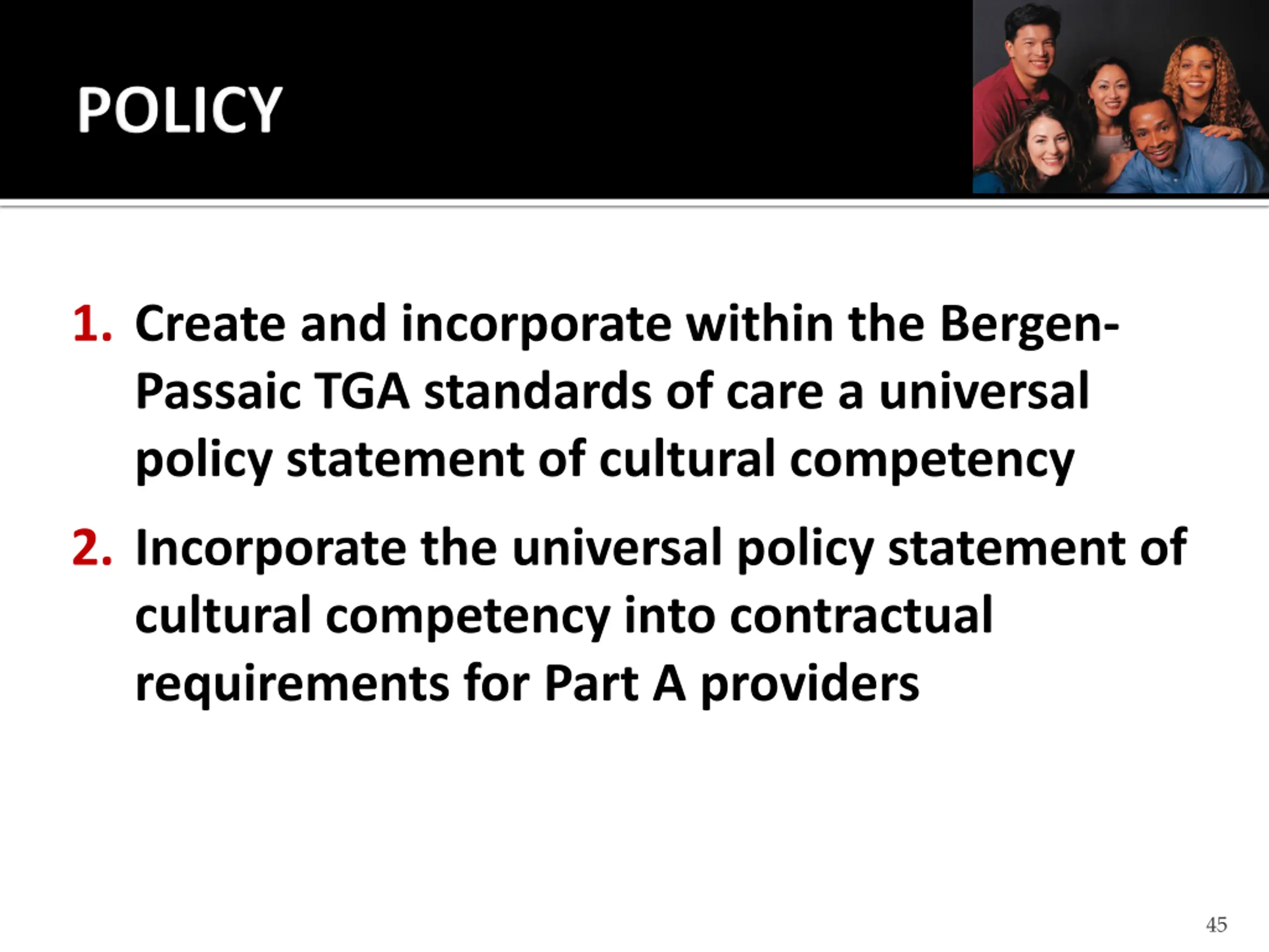15 Ryan White Part A providers, four Minority AIDS Initiative (MAI) providers, and six HOPWA providers. 1. Create and incorporate within the Bergen- Passaic TGA standards of care a universal policy statement of cultural competency 2. Incorporate the universal policy statement of cultural competency into contractual requirements for Part A providers 45