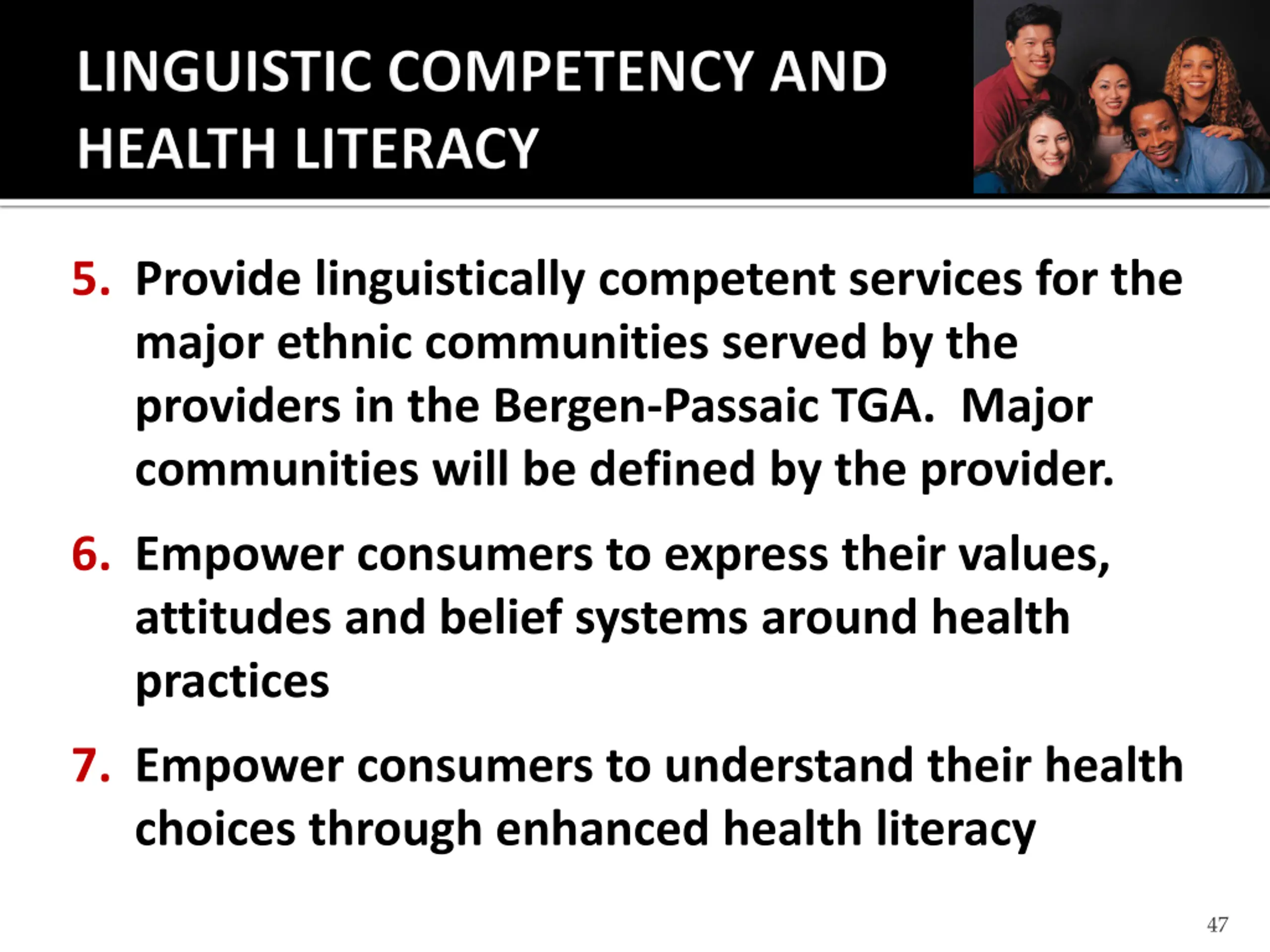 15 Ryan White Part A providers, four Minority AIDS Initiative (MAI) providers, and six HOPWA providers. 5. Provide linguistically competent services for the major ethnic communities served by the providers in the Bergen-Passaic TGA. Major communities will be defined by the provider. 6. Empower consumers to express their values, attitudes and belief systems around health practices 7. Empower consumers to understand their health choices through enhanced health literacy 47