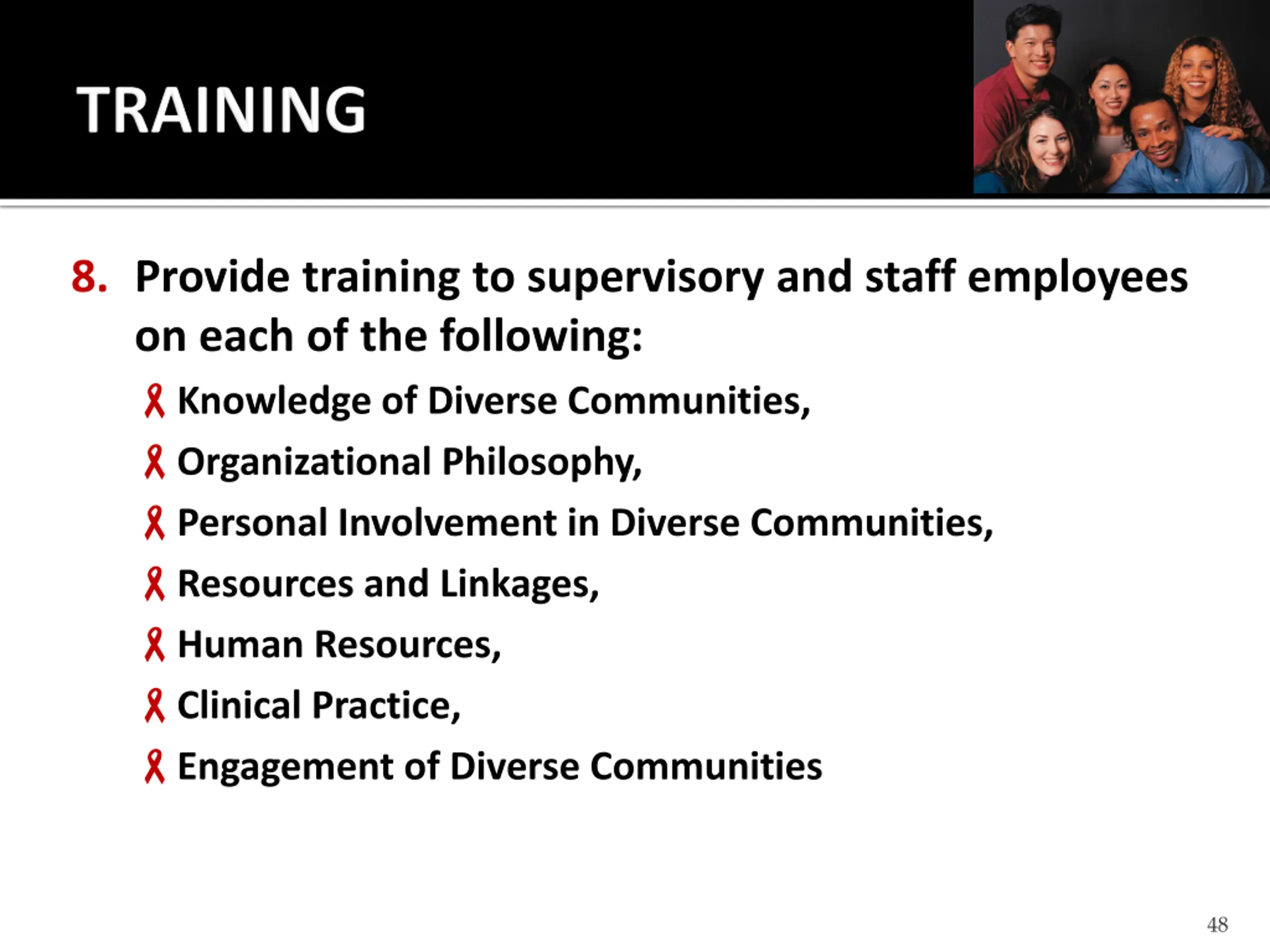 15 Ryan White Part A providers, four Minority AIDS Initiative (MAI) providers, and six HOPWA providers. 1. HIV/AIDS service providers should ensure that the services that consumers receive from all staff are client centered, understandable, respectful, outcome oriented and compatible with clients cultural beliefs, practices and preferred language. 2. HIV/AIDS service providers should implement strategies to recruit, retain, and promote diverse staff and leadership at all levels of the organization that are representative of the demographic characteristics of the service area. 3. HIV/AIDS service providers should ensure that staff at all levels and across all disciplines receives ongoing education and training in culturally and linguistically appropriate service delivery. 4. HIV/AIDS service providers should render all services in the preferred language of their clients at every point of service delivery, utilizing the services of bilingual staff and interpreters at no cost to the client. 40