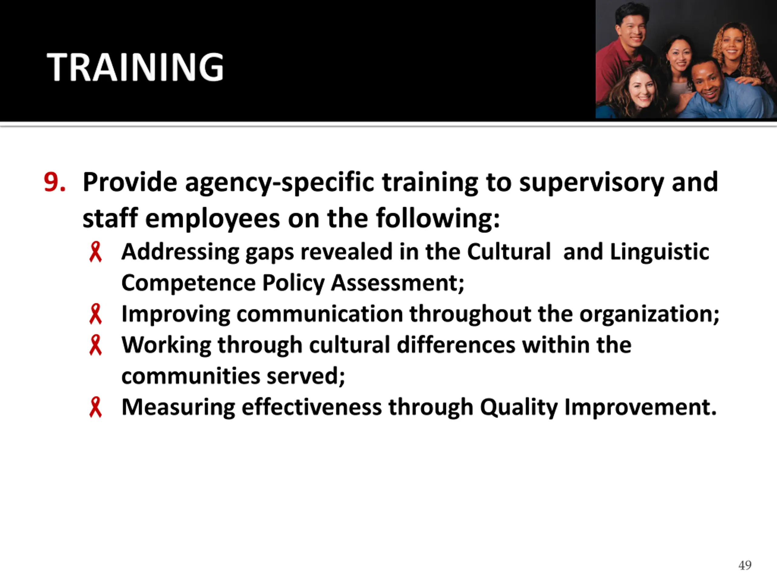 15 Ryan White Part A providers, four Minority AIDS Initiative (MAI) providers, and six HOPWA providers. 9. Provide agency-specific training to supervisory and staff employees on the following: Addressing gaps revealed in the Cultural and Linguistic Competence Policy Assessment; Improving communication throughout the organization; Working through cultural differences within the communities served; Measuring effectiveness through Quality Improvement. 49