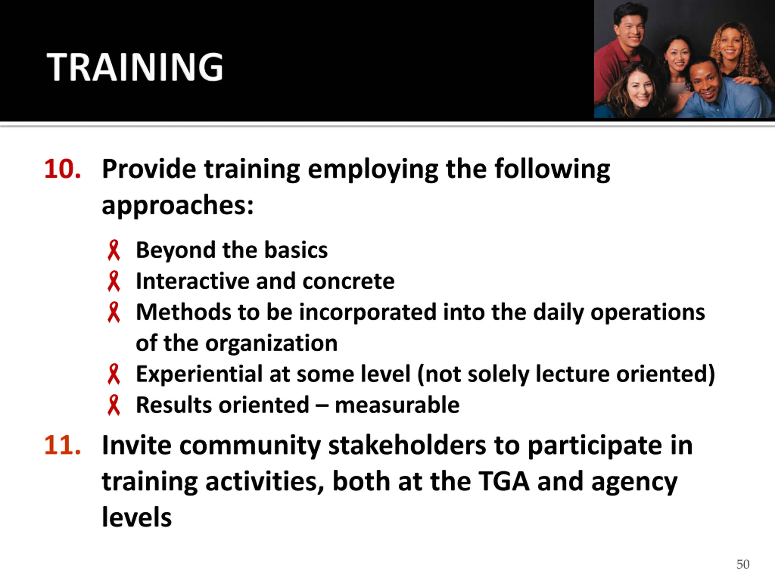 15 Ryan White Part A providers, four Minority AIDS Initiative (MAI) providers, and six HOPWA providers. 10. Provide training employing the following approaches: Beyond the basics Interactive and concrete Methods to be incorporated into the daily operations of the organization Experiential at some level (not solely lecture oriented) Results oriented measurable 11. Invite community stakeholders to participate in training activities, both at the TGA and agency levels 50