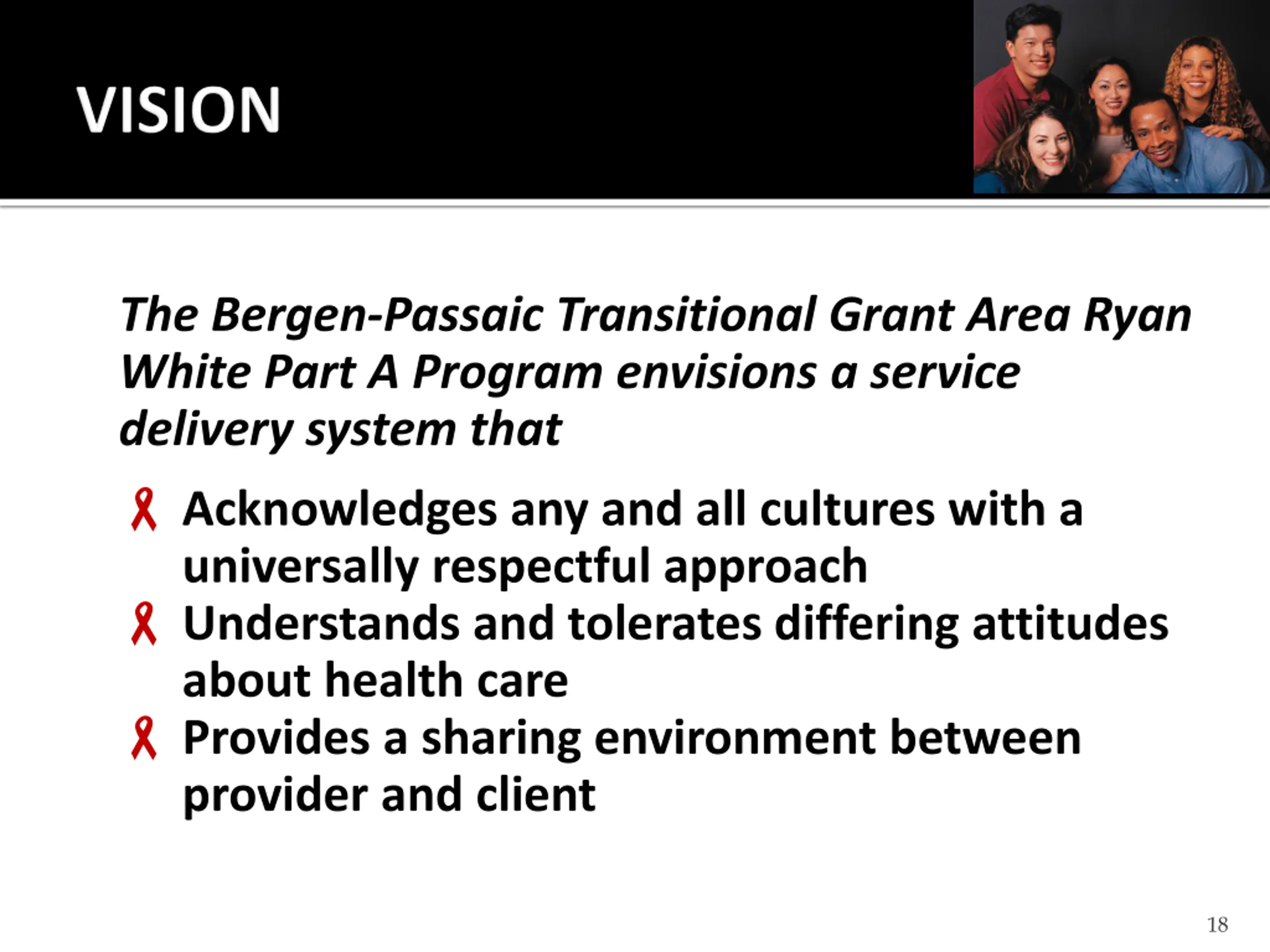 15 Ryan White Part A providers, four Minority AIDS Initiative (MAI) providers, and six HOPWA providers. The Bergen-Passaic Transitional Grant Area Ryan White Part A Program envisions a service delivery system that Acknowledges any and all cultures with a universally respectful approach Understands and tolerates differing attitudes about health care Provides a sharing environment between provider and client 18
