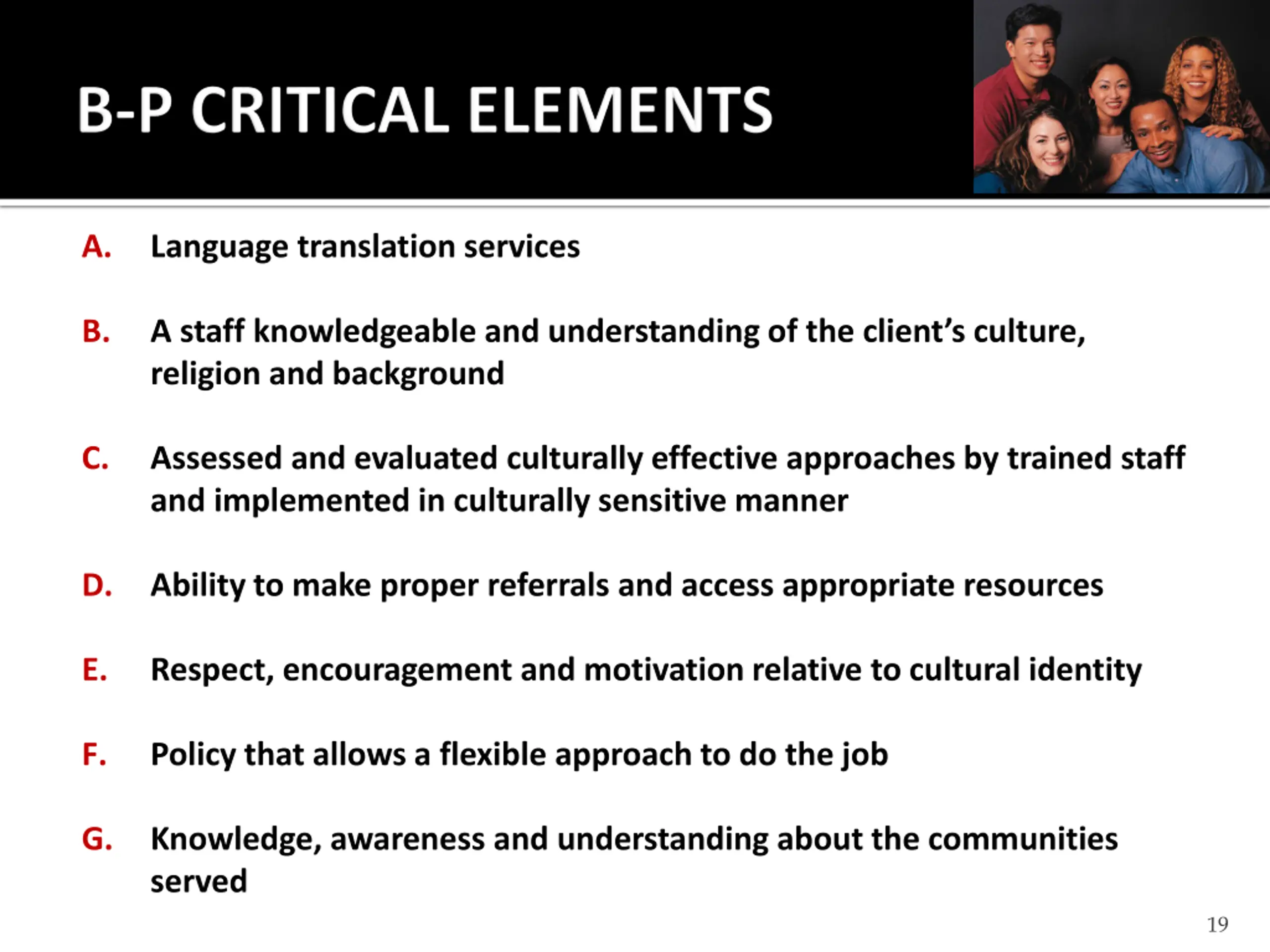 15 Ryan White Part A providers, four Minority AIDS Initiative (MAI) providers, and six HOPWA providers. A. Language translation services B. A staff knowledgeable and understanding of the client s culture, religion and background C. Assessed and evaluated culturally effective approaches by trained staff and implemented in culturally sensitive manner D. Ability to make proper referrals and access appropriate resources E. Respect, encouragement and motivation relative to cultural identity F. Policy that allows a flexible approach to do the job G. Knowledge, awareness and understanding about the communities served 19