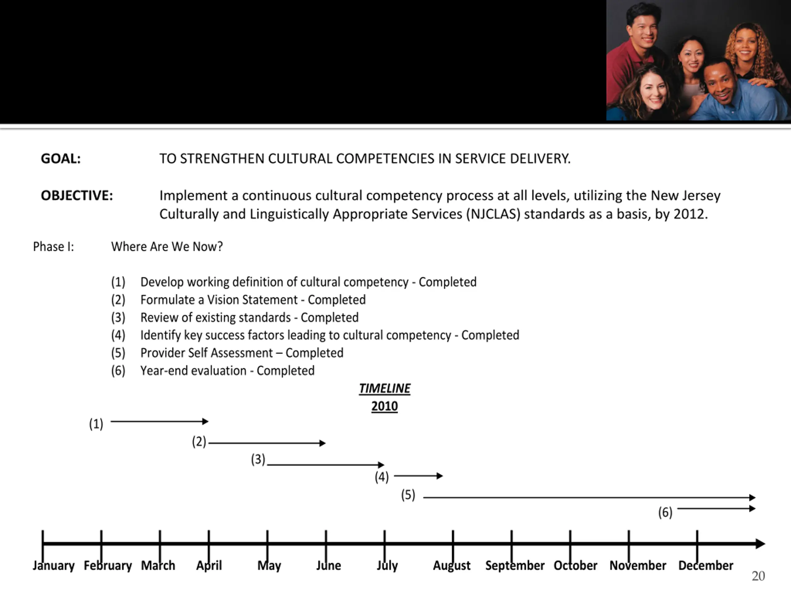 15 Ryan White Part A providers, four Minority AIDS Initiative (MAI) providers, and six HOPWA providers. GOAL: TO STRENGTHEN CULTURAL COMPETENCIES IN SERVICE DELIVERY. OBJECTIVE: Implement a continuous cultural competency process at all levels, utilizing the New Jersey Culturally and Linguistically Appropriate Services (NJCLAS) standards as a basis, by 2012. Phase I: Where Are We Now? (1)Develop working definition of cultural competency - Completed (2)Formulate a Vision Statement - Completed (3)Review of existing standards - Completed (4)Identify key success factors leading to cultural competency - Completed (5)Provider Self Assessment Completed (6)Year-end evaluation - Completed TIMELINE 2010 (1) (2) (3) (4) (5) January February March April May June July August September October November December (6) 20