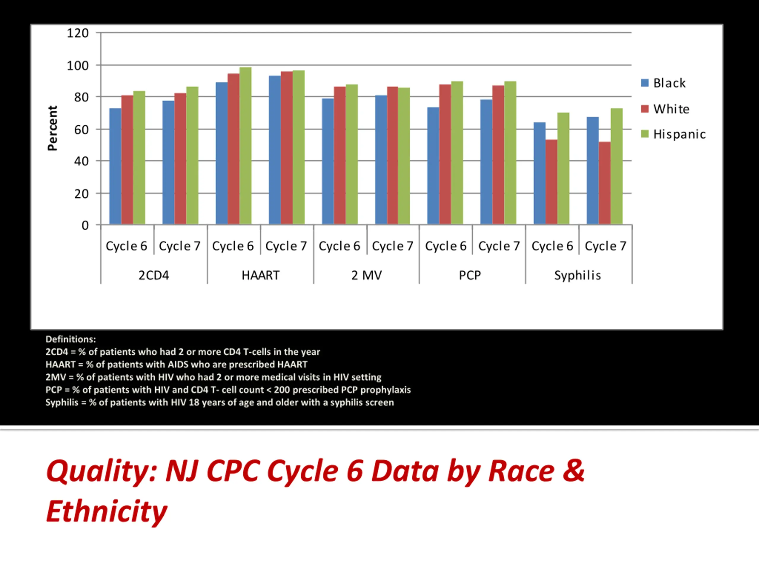 120 100 Black 80 White Percent 60 Hispanic 40 20 0 Cycle 6 Cycle 7 Cycle 6 Cycle 7 Cycle 6 Cycle 7 Cycle 6 Cycle 7 Cycle 6 Cycle 7 2CD4 HAART 2 MV PCP Syphilis Definitions: 2CD4 = % of patients who had 2 or more CD4 T-cells in the year HAART = % of patients with AIDS who are prescribed HAART 2MV = % of patients with HIV who had 2 or more medical visits in HIV setting PCP = % of patients with HIV and CD4 T- cell count < 200 prescribed PCP prophylaxis Syphilis = % of patients with HIV 18 years of age and older with a syphilis screen Quality: NJ CPC Cycle 6 Data by Race & Ethnicity