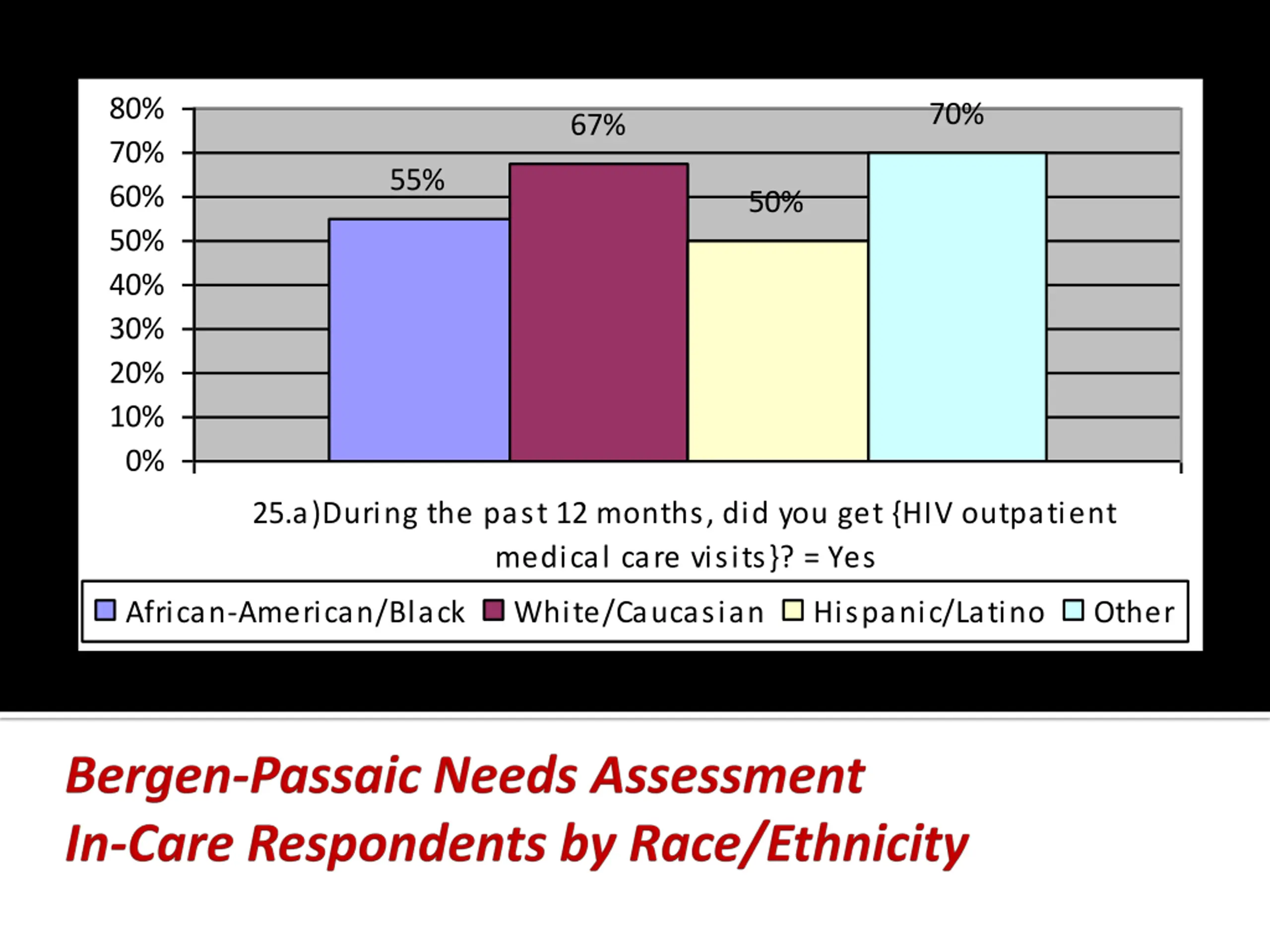 80% 70% 67% 70% 55% 60% 50% 50% 40% 30% 20% 10% 0% 25.a)During the past 12 months, did you get {HIV outpatient medical care visits}? = Yes African-American/Black White/Caucasian Hispanic/Latino Other