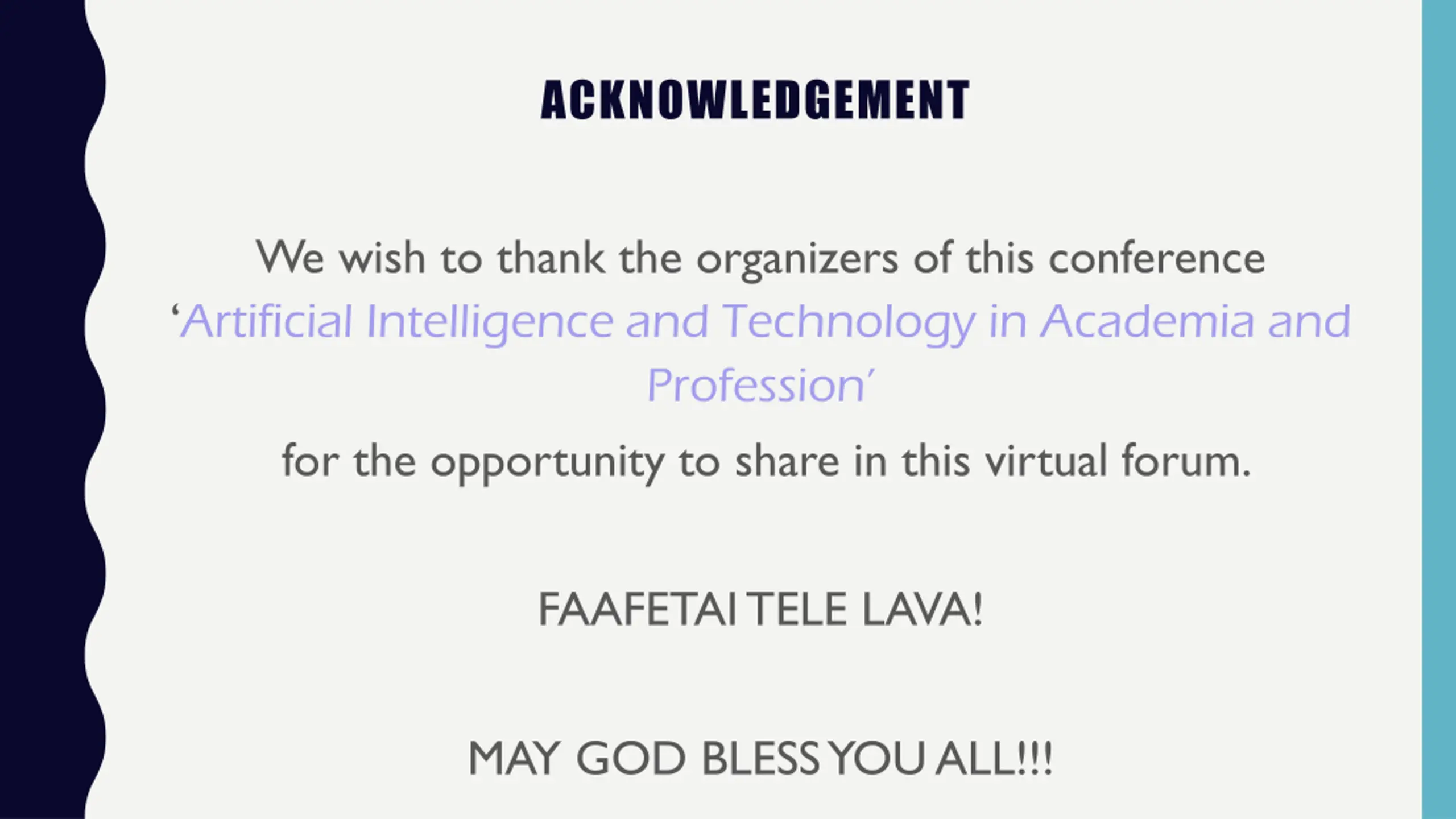 ACKNOWLEDGEMENT We wish to thank the organizers of this conference Artificial Intelligence and Technology in Academia and Profession for the opportunity to share in this virtual forum. FAAFETAI TELE LAVA! MAY GOD BLESS YOU ALL!!!