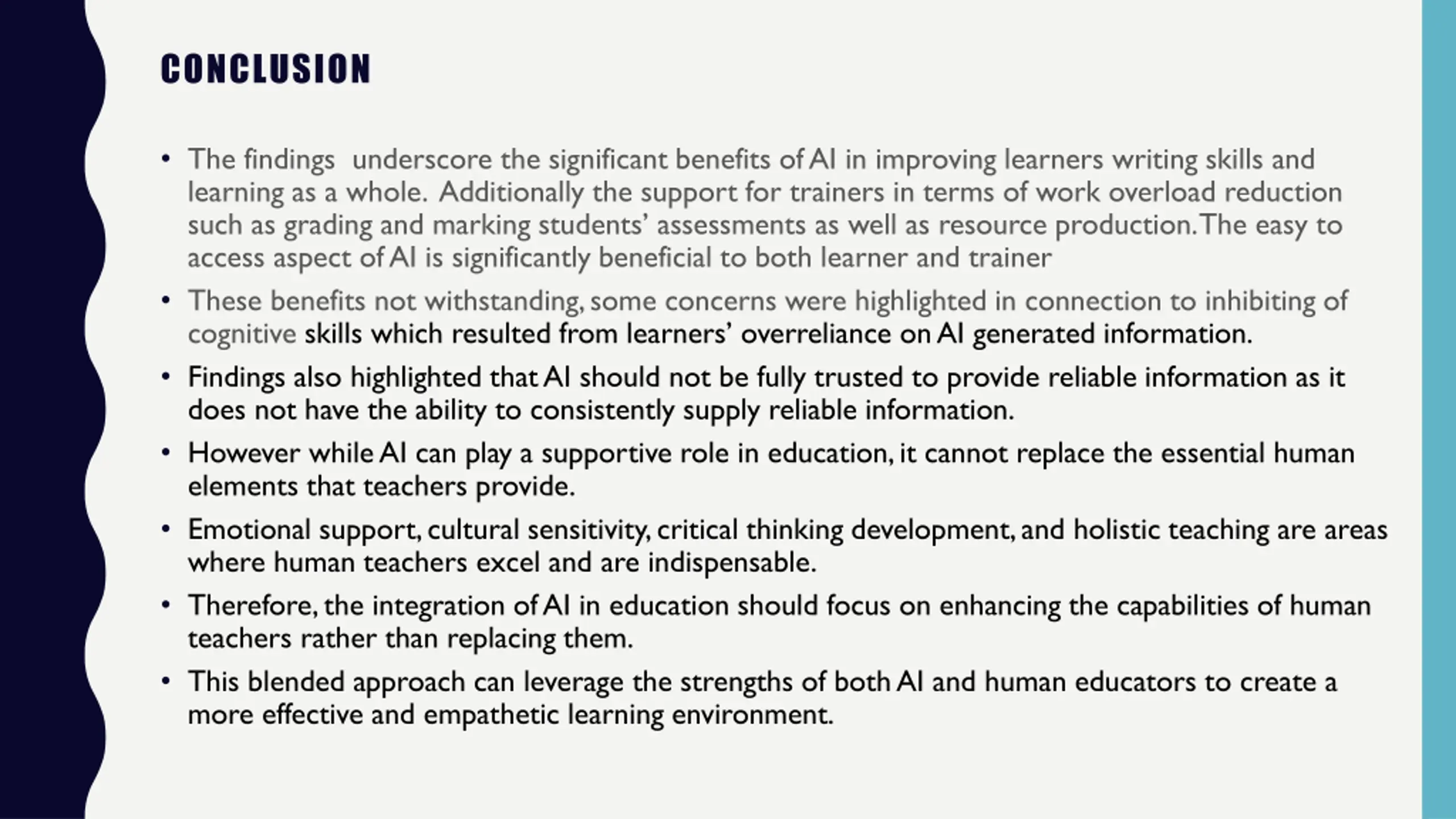 CONCLUSION The findings underscore the significant benefits of AI in improving learners writing skills and learning as a whole. Additionally the support for trainers in terms of work overload reduction such as grading and marking students assessments as well as resource production. The easy to access aspect of AI is significantly beneficial to both learner and trainer These benefits not withstanding, some concerns were highlighted in connection to inhibiting of cognitive skills which resulted from learners overreliance on AI generated information. Findings also highlighted that AI should not be fully trusted to provide reliable information as it does not have the ability to consistently supply reliable information. However while AI can play a supportive role in education, it cannot replace the essential human elements that teachers provide. Emotional support, cultural sensitivity, critical thinking development, and holistic teaching are areas where human teachers excel and are indispensable. Therefore, the integration of AI in education should focus on enhancing the capabilities of human teachers rather than replacing them. This blended approach can leverage the strengths of both AI and human educators to create a more effective and empathetic learning environment.