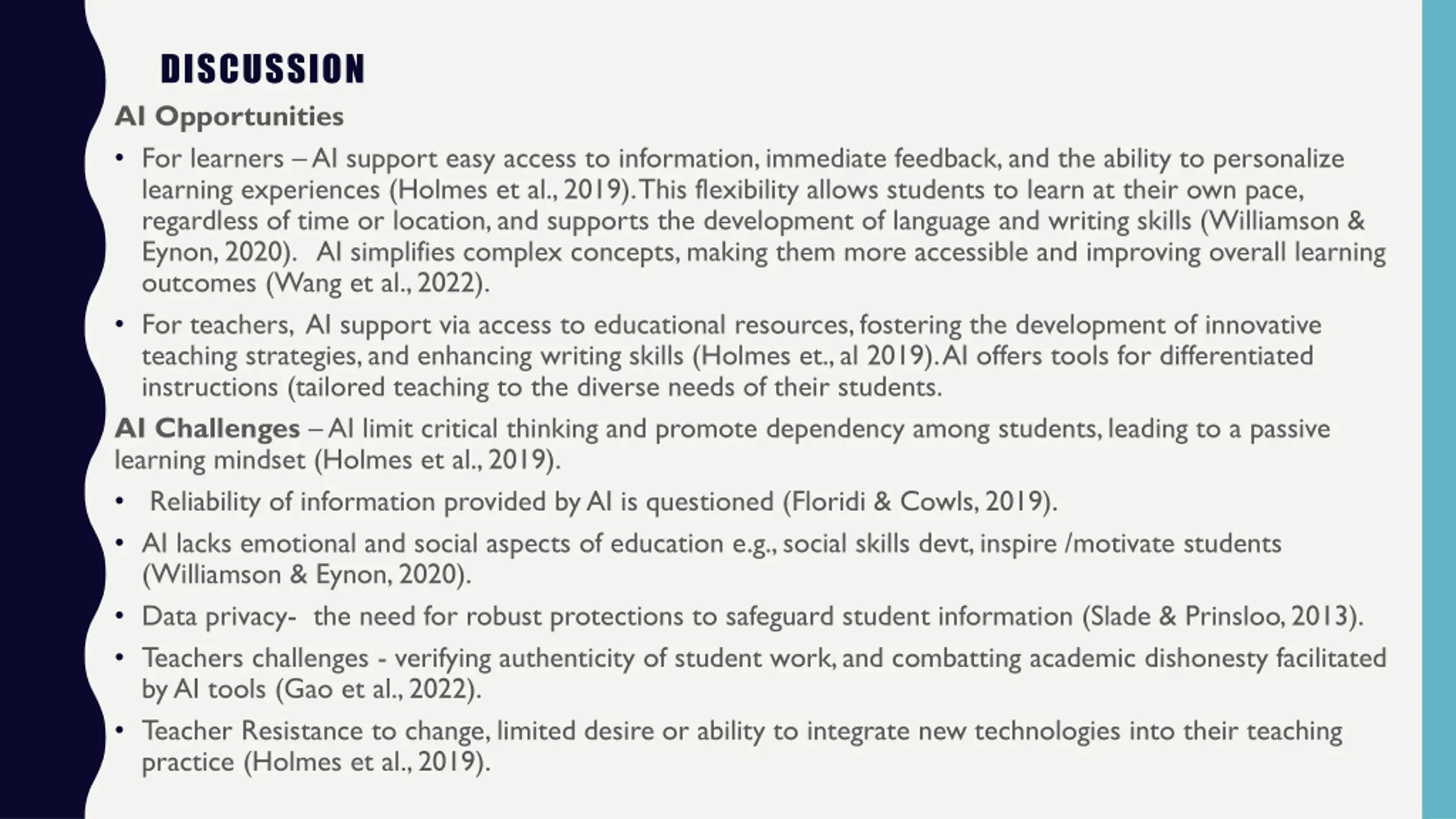 DISCUSSION AI Opportunities For learners AI support easy access to information, immediate feedback, and the ability to personalize learning experiences (Holmes et al., 2019). This flexibility allows students to learn at their own pace, regardless of time or location, and supports the development of language and writing skills (Williamson & Eynon, 2020). AI simplifies complex concepts, making them more accessible and improving overall learning outcomes (Wang et al., 2022). For teachers, AI support via access to educational resources, fostering the development of innovative teaching strategies, and enhancing writing skills (Holmes et., al 2019). AI offers tools for differentiated instructions (tailored teaching to the diverse needs of their students. AI Challenges AI limit critical thinking and promote dependency among students, leading to a passive learning mindset (Holmes et al., 2019). Reliability of information provided by AI is questioned (Floridi & Cowls, 2019). AI lacks emotional and social aspects of education e.g., social skills devt, inspire /motivate students (Williamson & Eynon, 2020). Data privacy- the need for robust protections to safeguard student information (Slade & Prinsloo, 2013). Teachers challenges - verifying authenticity of student work, and combatting academic dishonesty facilitated by AI tools (Gao et al., 2022). Teacher Resistance to change, limited desire or ability to integrate new technologies into their teaching practice (Holmes et al., 2019).