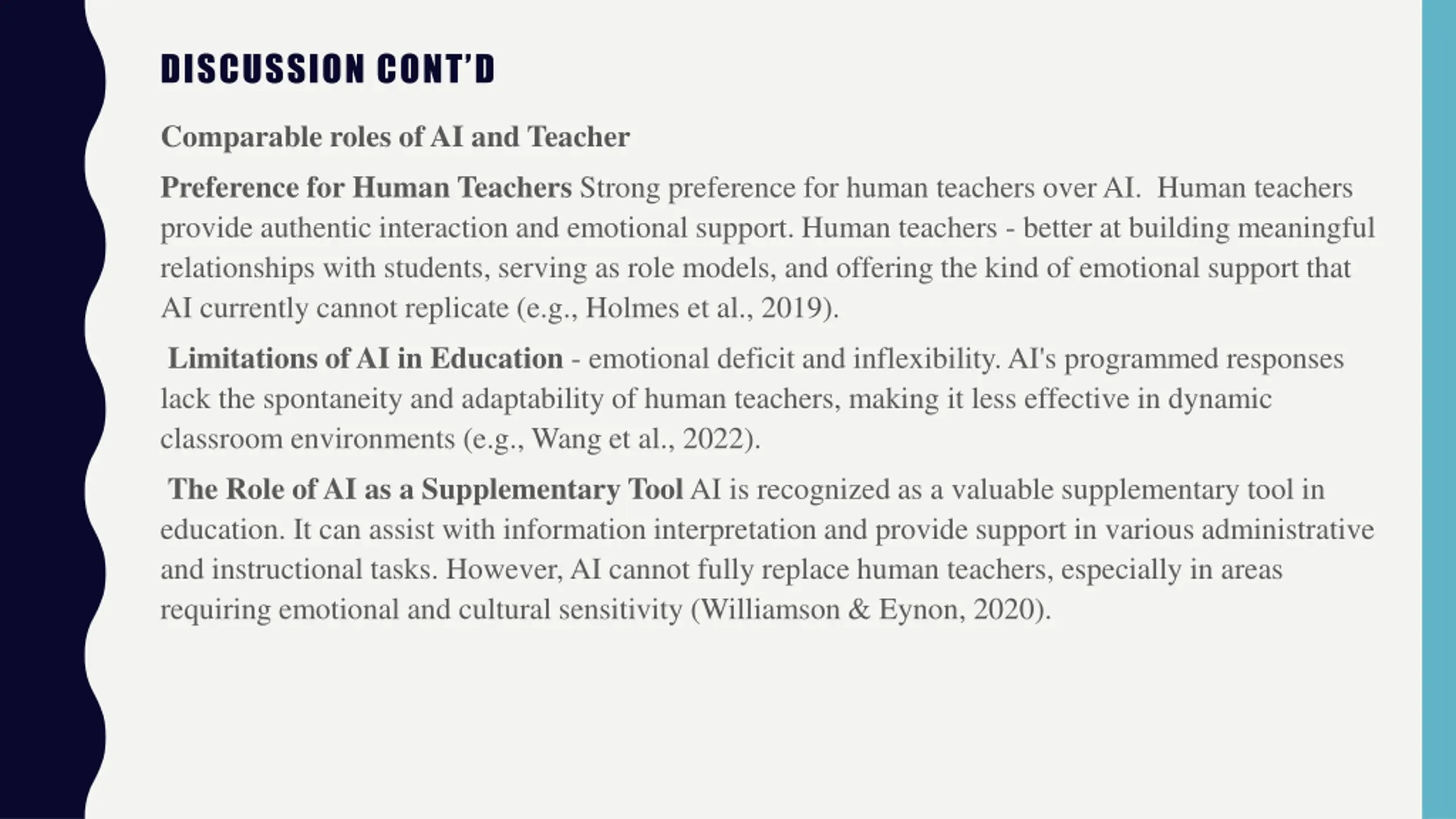 DISCUSSION CONTD Comparable roles of AI and Teacher Preference for Human Teachers Strong preference for human teachers over AI. Human teachers provide authentic interaction and emotional support. Human teachers - better at building meaningful relationships with students, serving as role models, and offering the kind of emotional support that AI currently cannot replicate (e.g., Holmes et al., 2019). Limitations of AI in Education - emotional deficit and inflexibility. AI's programmed responses lack the spontaneity and adaptability of human teachers, making it less effective in dynamic classroom environments (e.g., Wang et al., 2022). The Role of AI as a Supplementary Tool AI is recognized as a valuable supplementary tool in education. It can assist with information interpretation and provide support in various administrative and instructional tasks. However, AI cannot fully replace human teachers, especially in areas requiring emotional and cultural sensitivity (Williamson & Eynon, 2020).