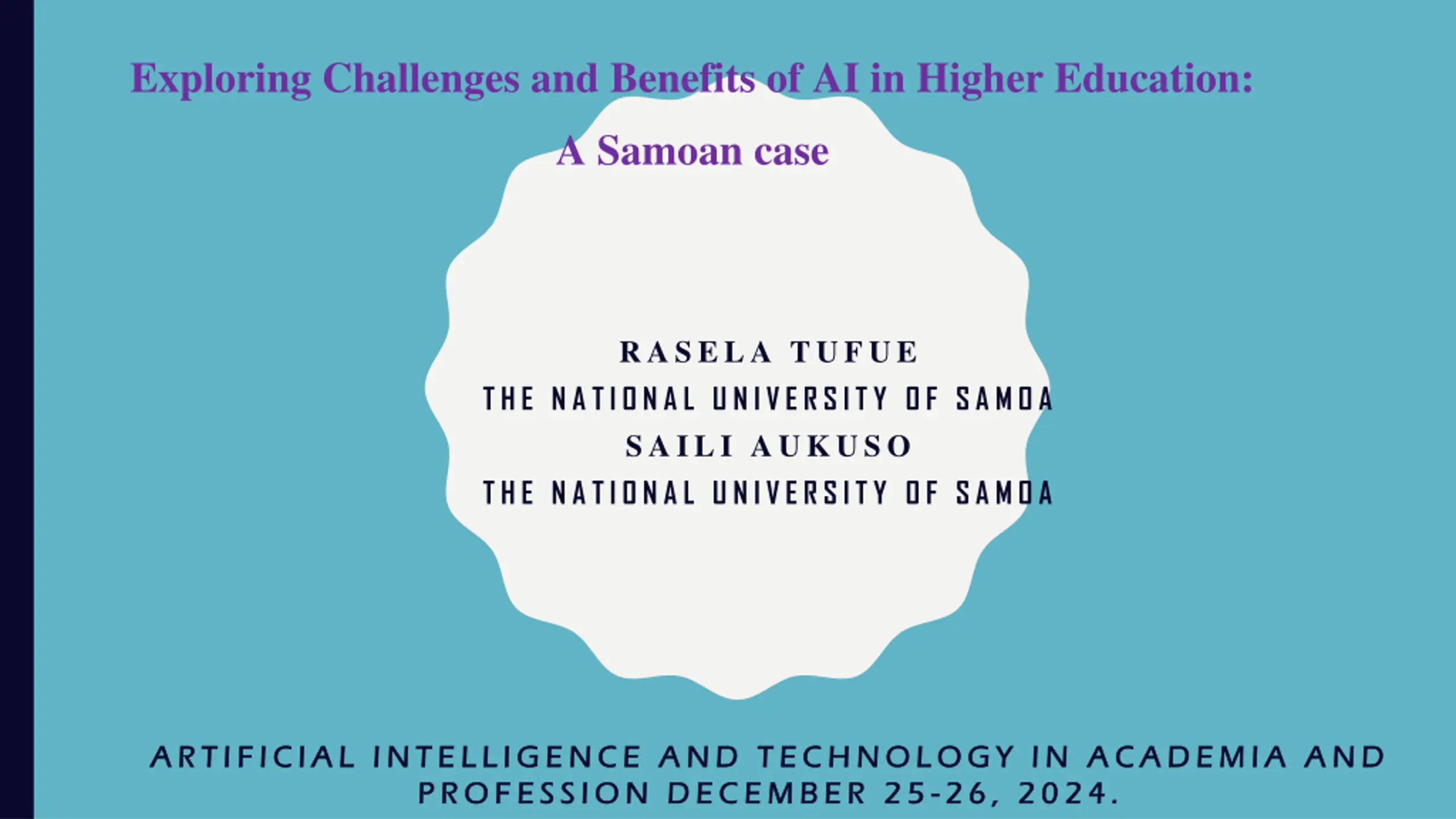 Exploring Challenges and Benefits of AI in Higher Education: A Samoan case RASELA TUFUE THE N A TION A L U N IVERSITY OF SA MOA SAILI AUKUSO THE N A TION A L U N IVERSITY OF SA MOA A R T I FICIAL I N T EL L IGENC E A N D T EC H N OL OGY I N A C A D EMIA A N D A R T I FICIAL I N T EL L IGENC E A N D T EC H N OL OGY I N A C A D EMIA A N D P R OF ESS ION D EC EM BER 25 P R OF ESS ION D EC EM BER 25 - - 26, 2024. 26, 2024.