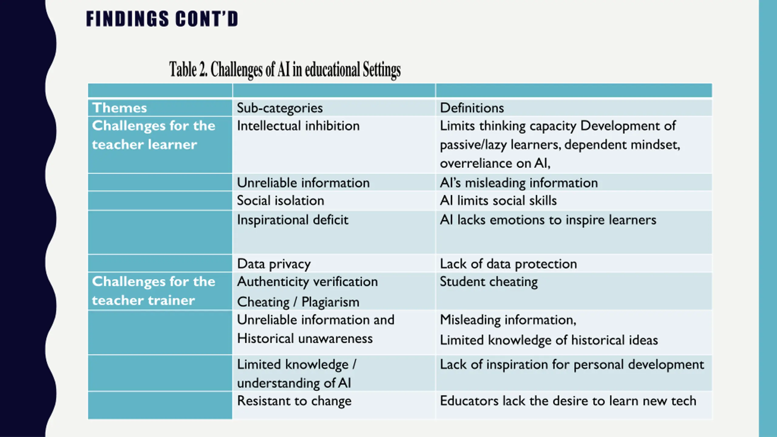 FINDINGS CONTD Table 2. Challenges of AI in educational Settings Themes Challenges for the teacher learner Sub-categories Intellectual inhibition Definitions Limits thinking capacity Development of passive/lazy learners, dependent mindset, overreliance on AI, AI s misleading information AI limits social skills AI lacks emotions to inspire learners Unreliable information Social isolation Inspirational deficit Data privacy Authenticity verification Cheating / Plagiarism Unreliable information and Historical unawareness Lack of data protection Student cheating Challenges for the teacher trainer Misleading information, Limited knowledge of historical ideas Limited knowledge / understanding of AI Resistant to change Lack of inspiration for personal development Educators lack the desire to learn new tech