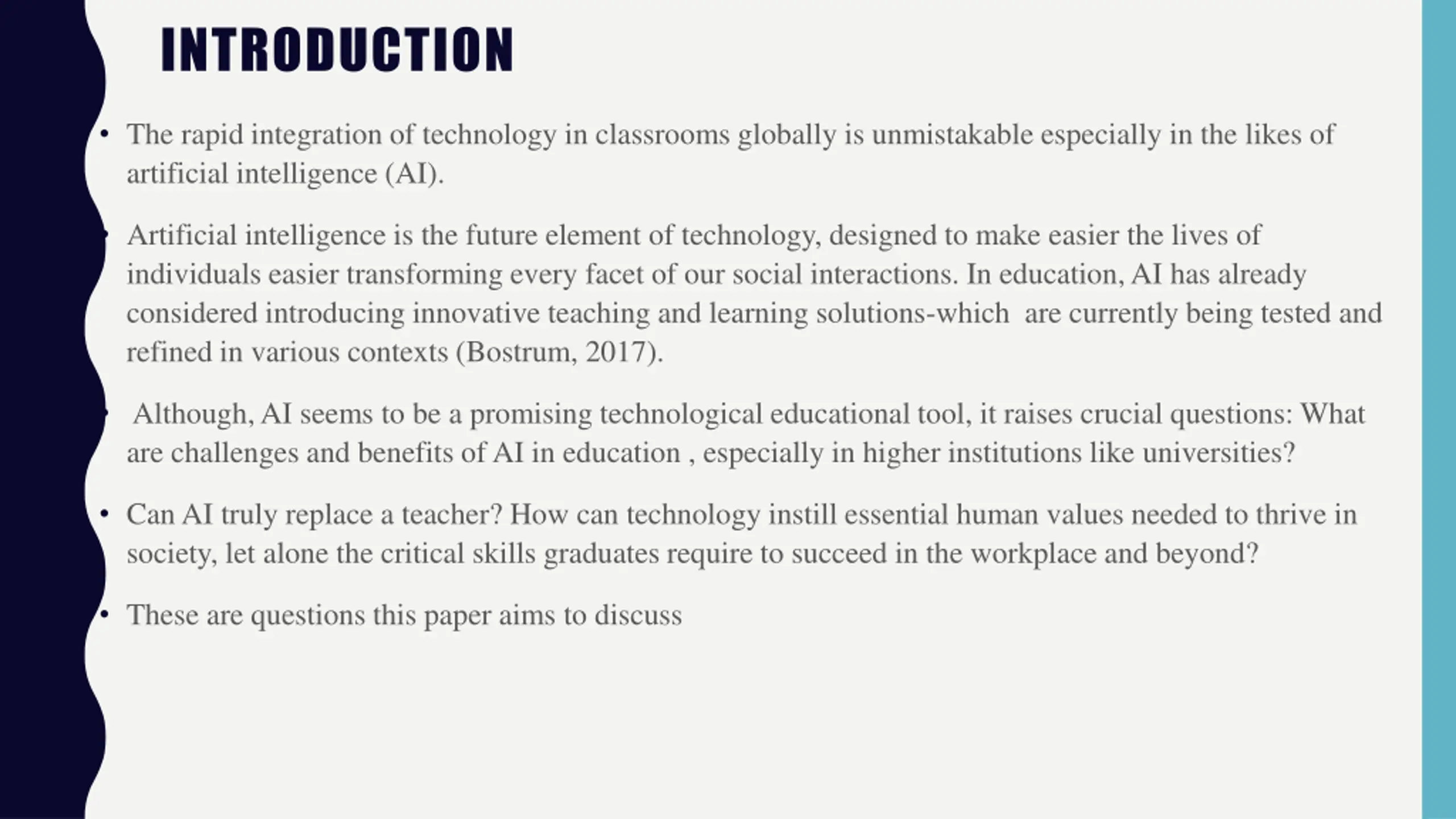 INTRODUCTION The rapid integration of technology in classrooms globally is unmistakable especially in the likes of artificial intelligence (AI). Artificial intelligence is the future element of technology, designed to make easier the lives of individuals easier transforming every facet of our social interactions. In education, AI has already considered introducing innovative teaching and learning solutions-which are currently being tested and refined in various contexts (Bostrum, 2017). Although, AI seems to be a promising technological educational tool, it raises crucial questions: What are challenges and benefits of AI in education , especially in higher institutions like universities? Can AI truly replace a teacher? How can technology instill essential human values needed to thrive in society, let alone the critical skills graduates require to succeed in the workplace and beyond? These are questions this paper aims to discuss