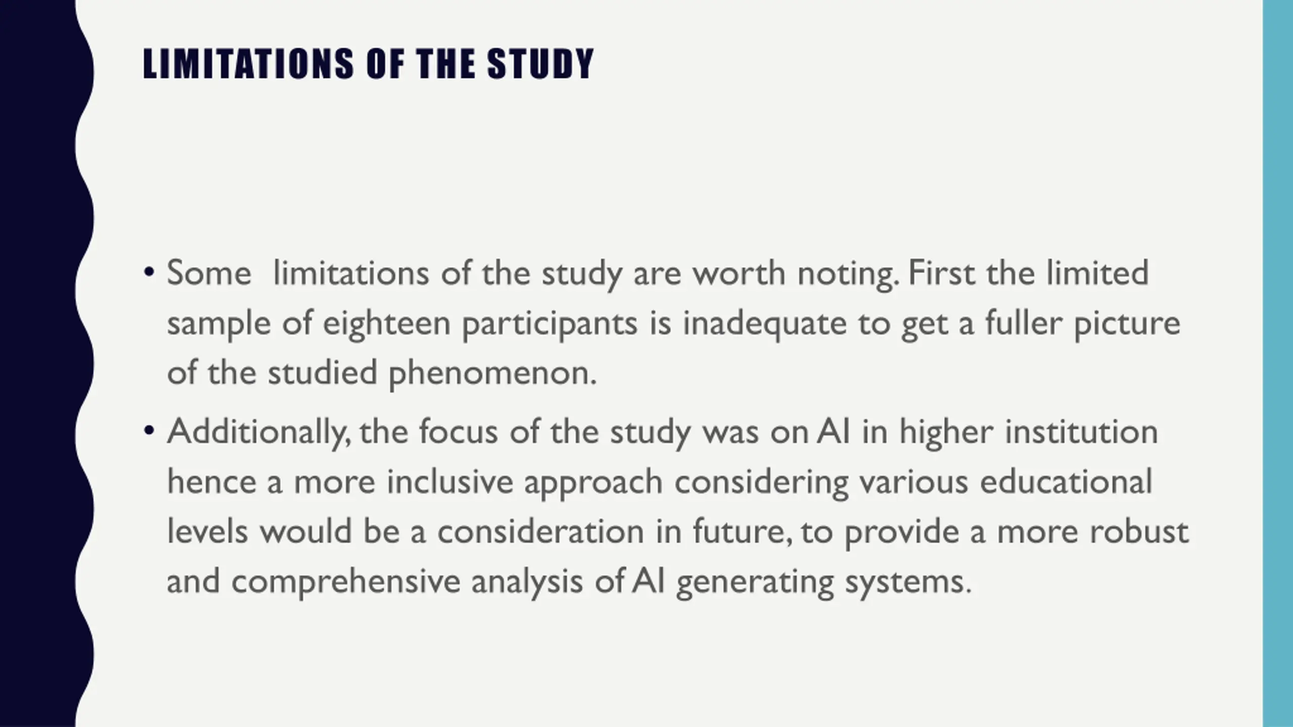 LIMITATIONS OF THE STUDY Some limitations of the study are worth noting. First the limited sample of eighteen participants is inadequate to get a fuller picture of the studied phenomenon. Additionally, the focus of the study was on AI in higher institution hence a more inclusive approach considering various educational levels would be a consideration in future, to provide a more robust and comprehensive analysis of AI generating systems.