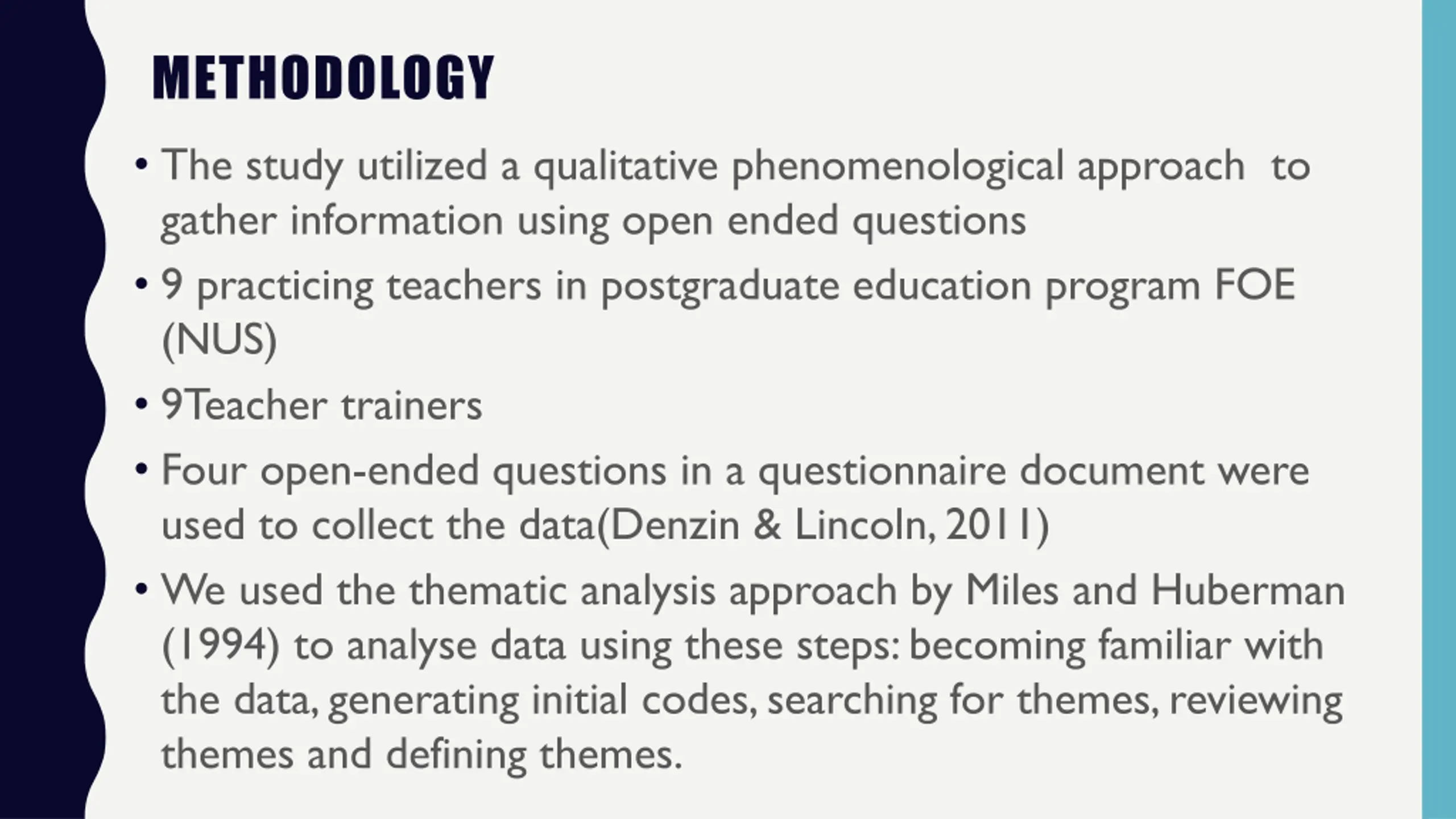 METHODOLOGY The study utilized a qualitative phenomenological approach to gather information using open ended questions 9 practicing teachers in postgraduate education program FOE (NUS) 9Teacher trainers Four open-ended questions in a questionnaire document were used to collect the data(Denzin & Lincoln, 2011) We used the thematic analysis approach by Miles and Huberman (1994) to analyse data using these steps: becoming familiar with the data, generating initial codes, searching for themes, reviewing themes and defining themes.