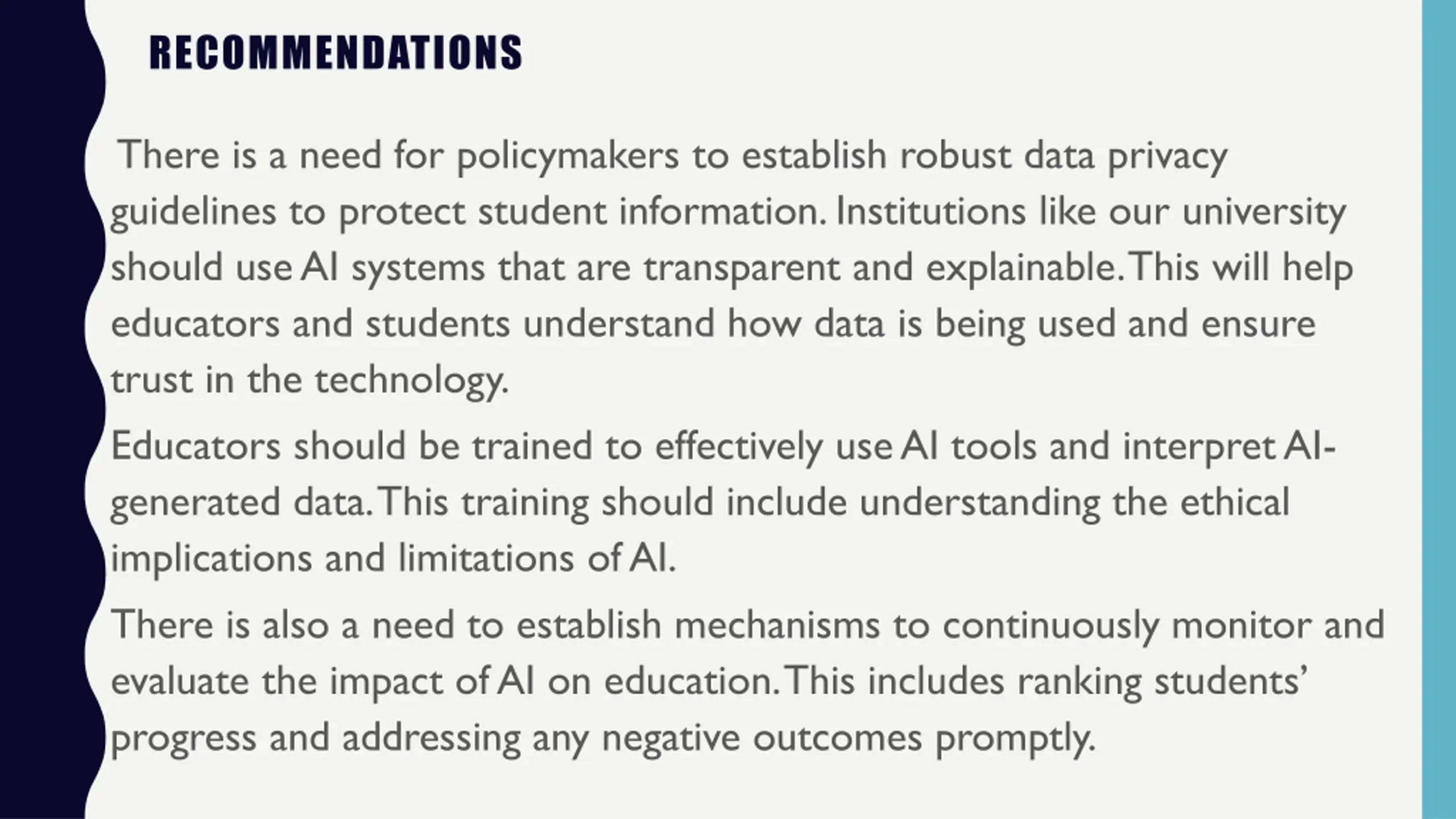 RECOMMENDATIONS There is a need for policymakers to establish robust data privacy guidelines to protect student information. Institutions like our university should use AI systems that are transparent and explainable. This will help educators and students understand how data is being used and ensure trust in the technology. Educators should be trained to effectively use AI tools and interpret AI- generated data. This training should include understanding the ethical implications and limitations of AI. There is also a need to establish mechanisms to continuously monitor and evaluate the impact of AI on education. This includes ranking students progress and addressing any negative outcomes promptly.