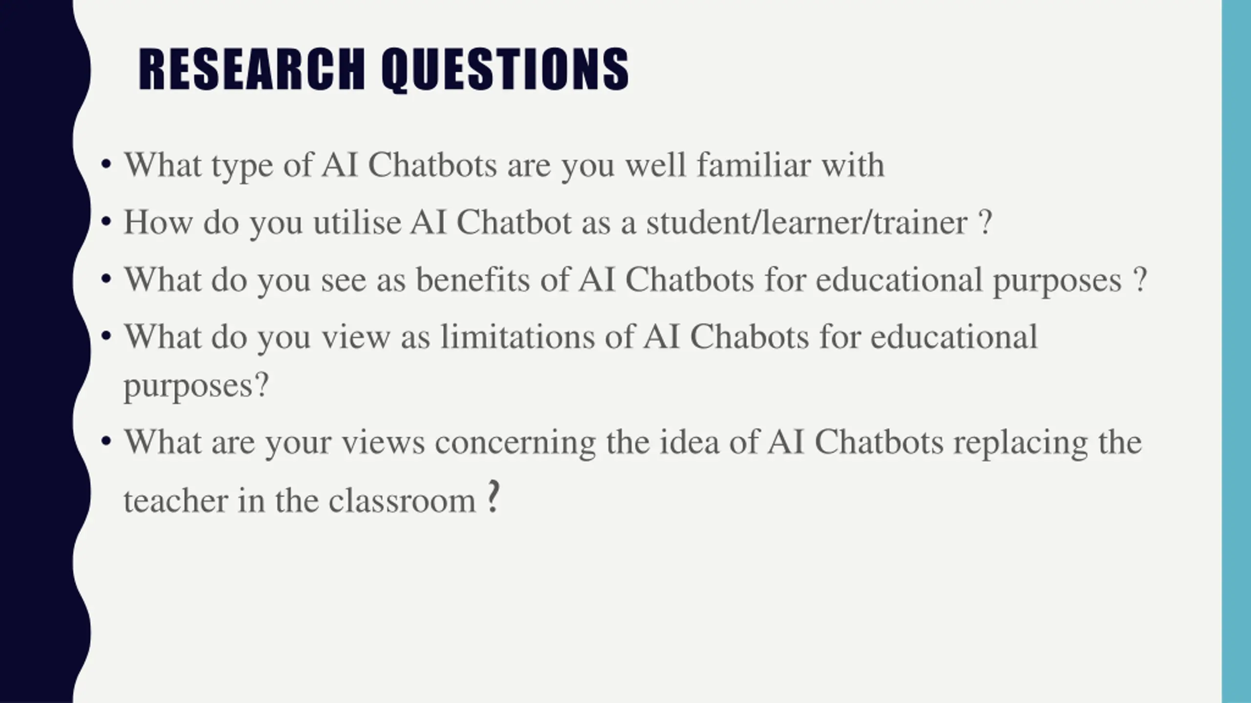 RESEARCH QUESTIONS What type of AI Chatbots are you well familiar with How do you utilise AI Chatbot as a student/learner/trainer ? What do you see as benefits of AI Chatbots for educational purposes ? What do you view as limitations of AI Chabots for educational purposes? What are your views concerning the idea of AI Chatbots replacing the teacher in the classroom ?