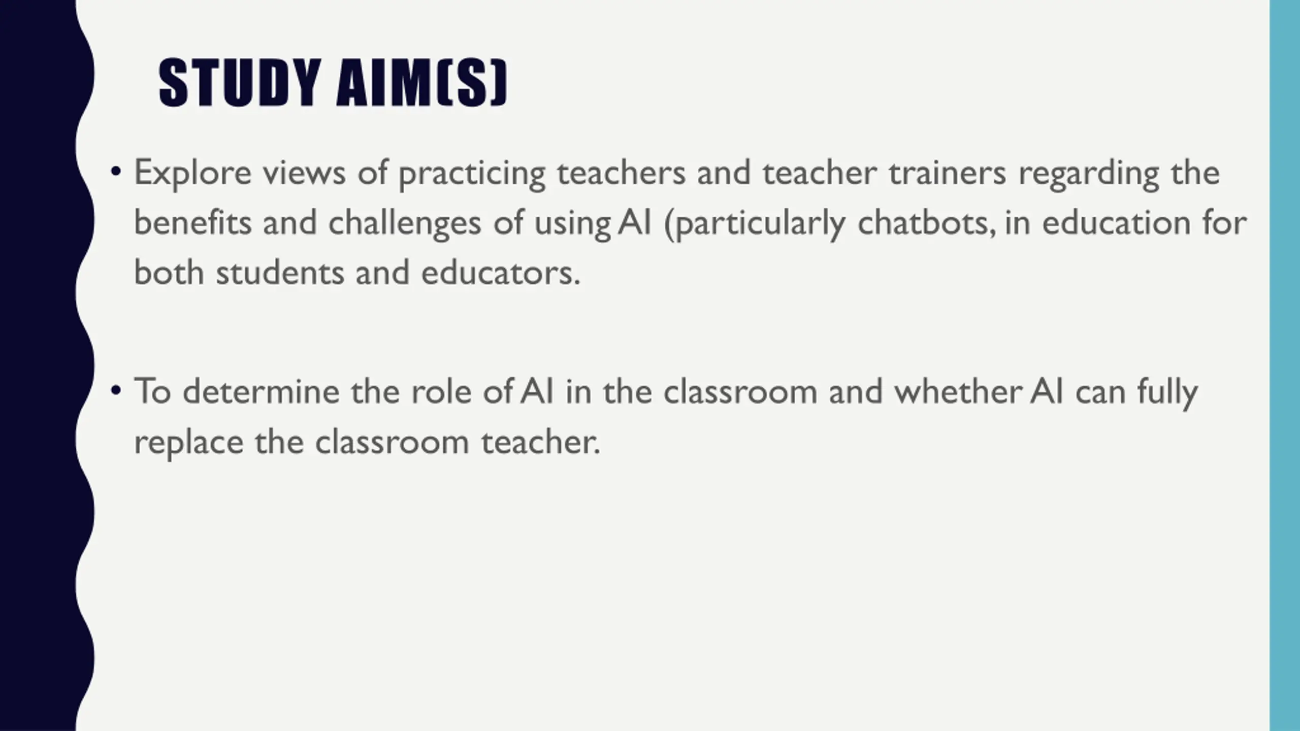 STUDY AIM(S) Explore views of practicing teachers and teacher trainers regarding the benefits and challenges of using AI (particularly chatbots, in education for both students and educators. To determine the role of AI in the classroom and whether AI can fully replace the classroom teacher.