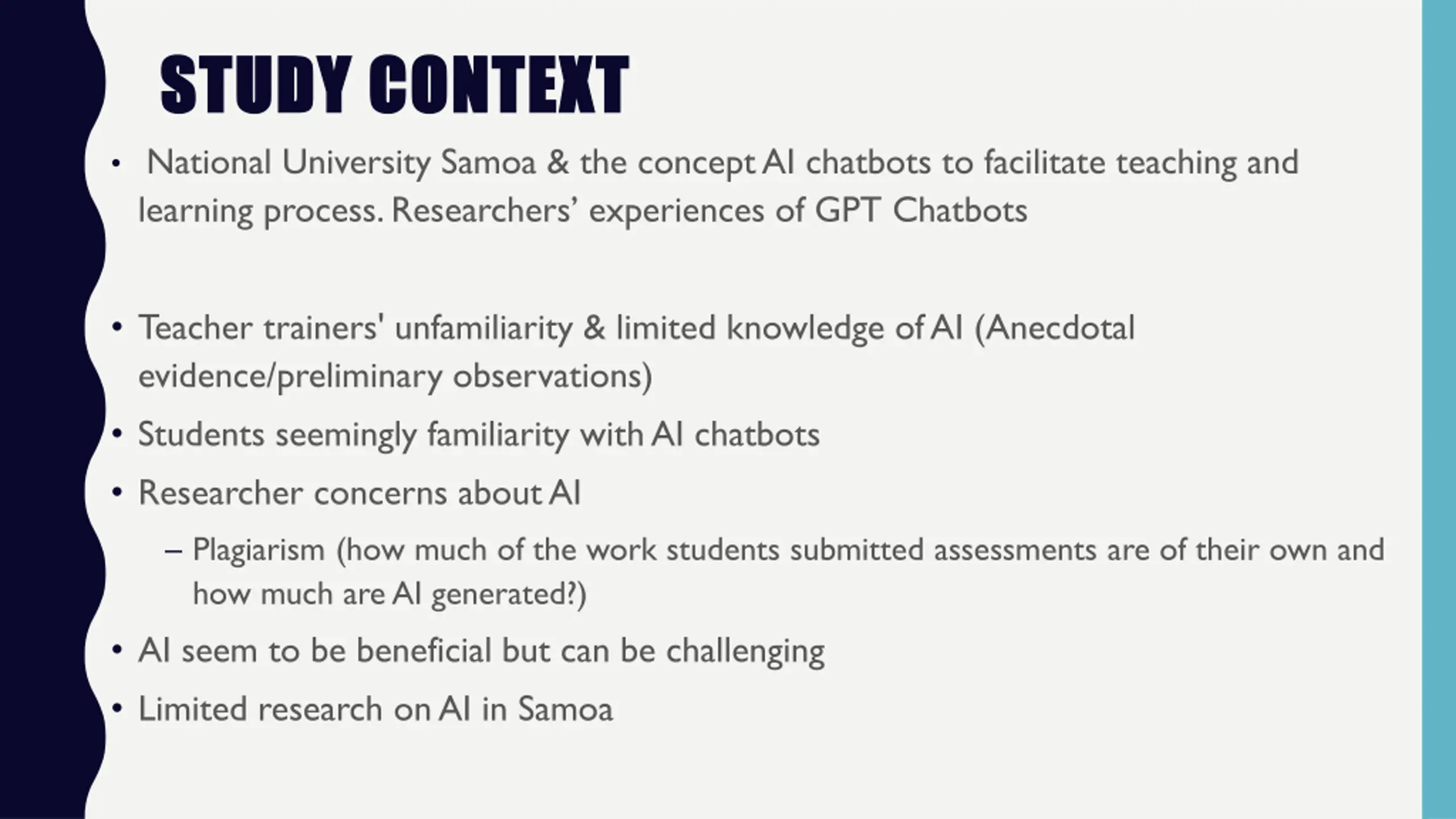 STUDY CONTEXT STUDY CONTEXT National University Samoa & the concept AI chatbots to facilitate teaching and learning process. Researchers experiences of GPT Chatbots Teacher trainers' unfamiliarity & limited knowledge of AI (Anecdotal evidence/preliminary observations) Students seemingly familiarity with AI chatbots Researcher concerns about AI Plagiarism (how much of the work students submitted assessments are of their own and how much are AI generated?) AI seem to be beneficial but can be challenging Limited research on AI in Samoa