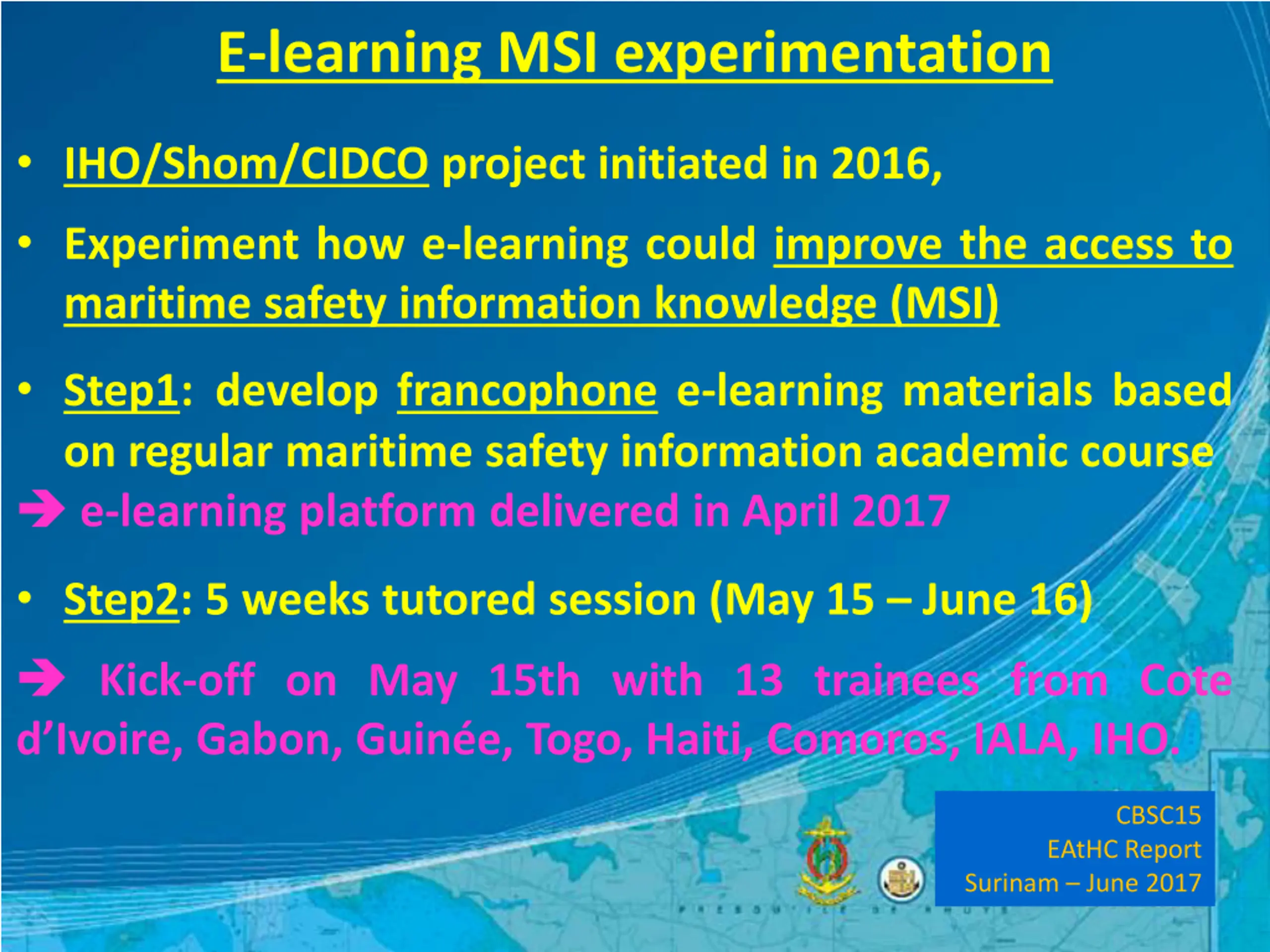 E-learning MSI experimentation IHO/Shom/CIDCO project initiated in 2016, Experiment how e-learning could improve the access to maritime safety information knowledge (MSI) Step1: develop francophone e-learning materials based on regular maritime safety information academic course e-learning platform delivered in April 2017 Step2: 5 weeks tutored session (May 15 June 16) Kick-off on May 15th with 13 trainees from Cote d Ivoire, Gabon, Guin e, Togo, Haiti, Comoros, IALA, IHO. CBSC15 EAtHC Report Surinam June 2017