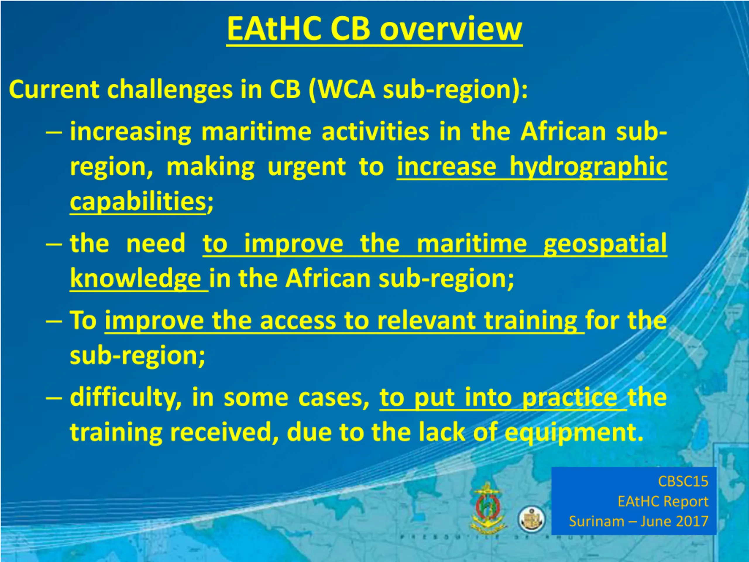 EAtHC CB overview Current challenges in CB (WCA sub-region): increasing maritime activities in the African sub- region, making urgent to increase hydrographic capabilities; the need to improve the maritime geospatial knowledge in the African sub-region; To improve the access to relevant training for the sub-region; difficulty, in some cases, to put into practice the training received, due to the lack of equipment. CBSC15 EAtHC Report Surinam June 2017