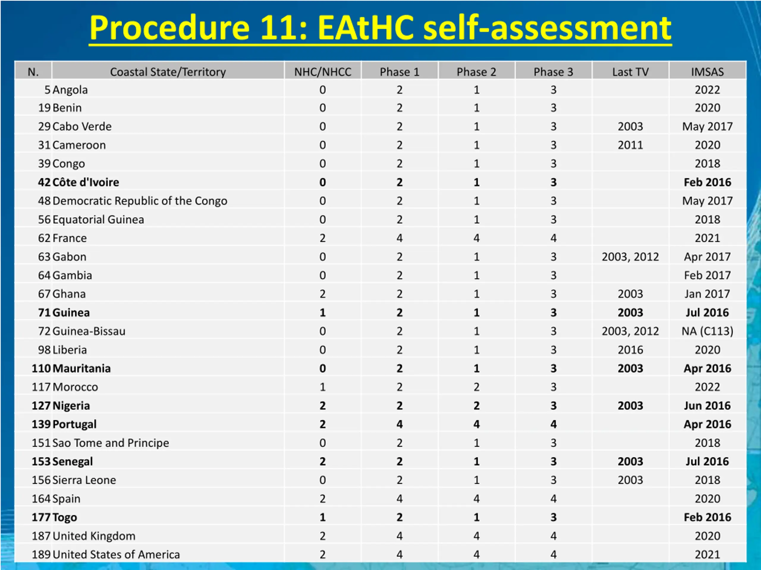 Procedure 11: EAtHC self-assessment N. Coastal State/Territory NHC/NHCC 0 0 0 0 0 0 0 0 2 0 0 2 1 0 0 0 1 2 2 0 2 0 2 1 2 2 Phase 1 2 2 2 2 2 2 2 2 4 2 2 2 2 2 2 2 2 2 4 2 2 2 4 2 4 4 Phase 2 1 1 1 1 1 1 1 1 4 1 1 1 1 1 1 1 2 2 4 1 1 1 4 1 4 4 Phase 3 3 3 3 3 3 3 3 3 4 3 3 3 3 3 3 3 3 3 4 3 3 3 4 3 4 4 Last TV IMSAS 2022 2020 May 2017 2020 2018 Feb 2016 May 2017 2018 2021 Apr 2017 Feb 2017 Jan 2017 Jul 2016 NA (C113) 2020 Apr 2016 2022 Jun 2016 Apr 2016 2018 Jul 2016 2018 2020 Feb 2016 2020 2021 5Angola 19Benin 29Cabo Verde 31Cameroon 39Congo 42C te d'Ivoire 48Democratic Republic of the Congo 56Equatorial Guinea 62France 63Gabon 64Gambia 67Ghana 71Guinea 72Guinea-Bissau 98Liberia 110Mauritania 117Morocco 127Nigeria 139Portugal 151Sao Tome and Principe 153Senegal 156Sierra Leone 164Spain 177Togo 187United Kingdom 189United States of America 2003 2011 2003, 2012 2003 2003 2003, 2012 2016 2003 2003 2003 2003 CBSC15 EAtHC Report Surinam June 2017