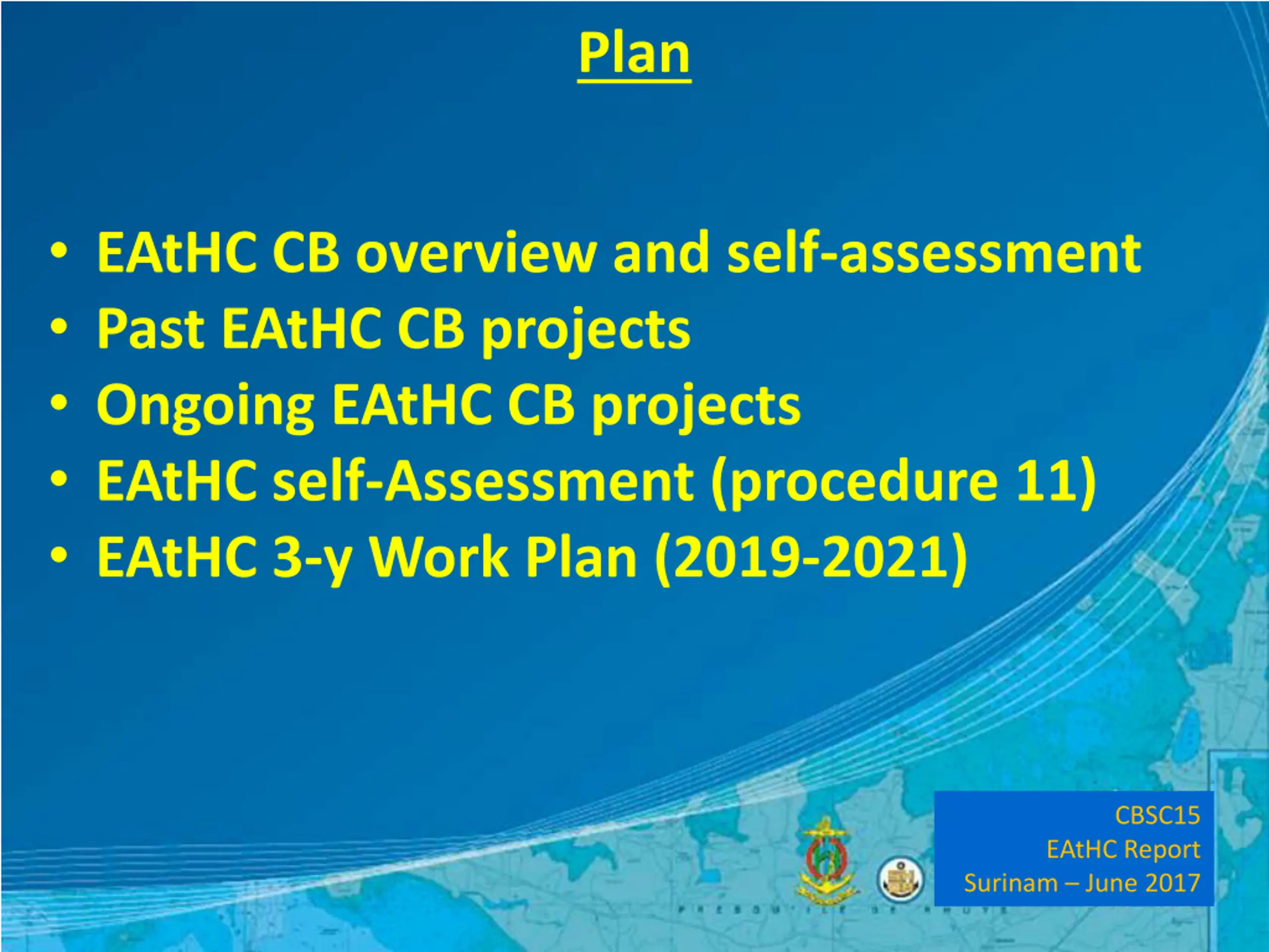 Plan EAtHC CB overview and self-assessment Past EAtHC CB projects Ongoing EAtHC CB projects EAtHC self-Assessment (procedure 11) EAtHC 3-y Work Plan (2019-2021) CBSC15 EAtHC Report Surinam June 2017