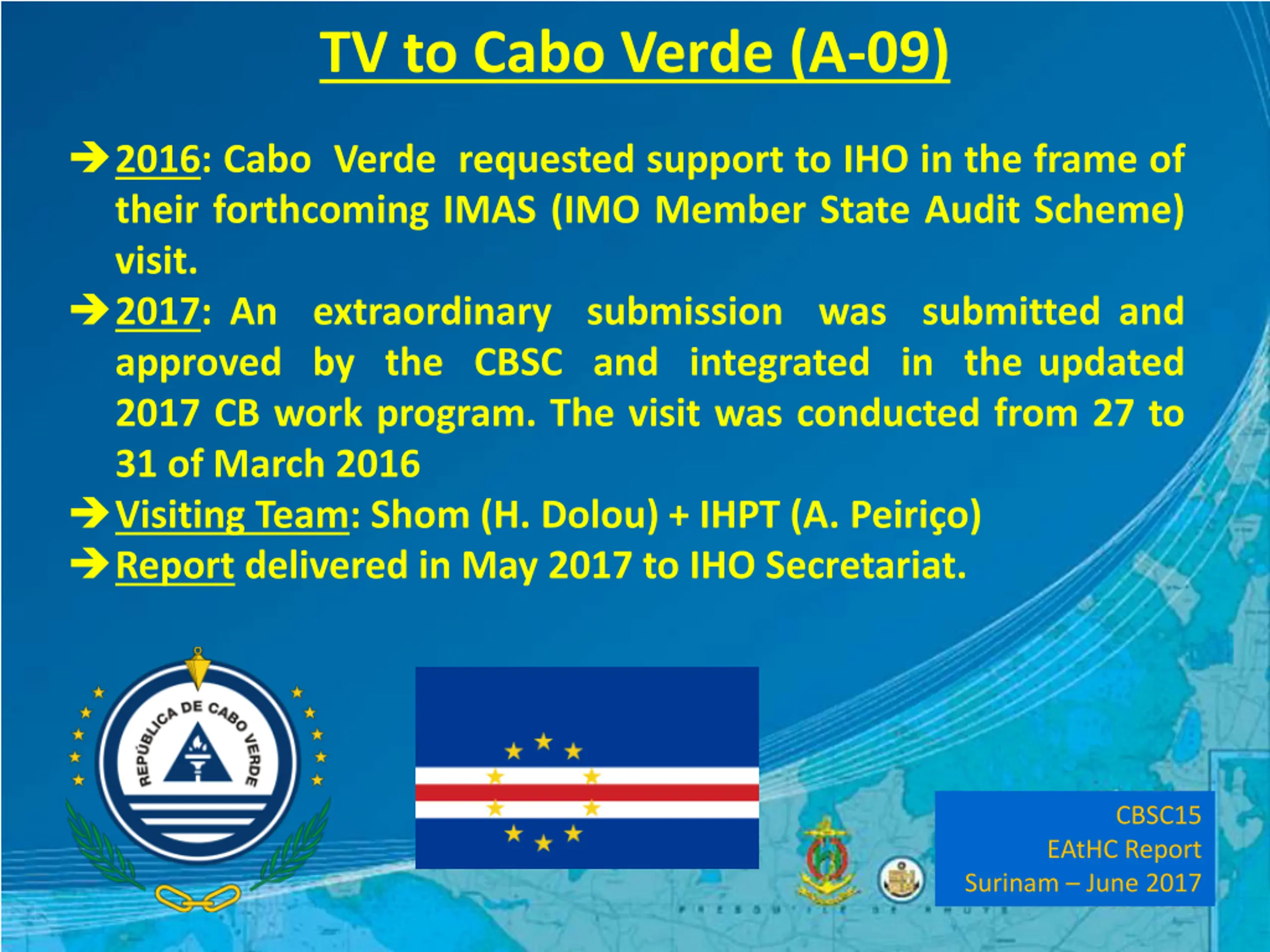 TV to Cabo Verde (A-09) 2016: Cabo Verde requested support to IHO in the frame of their forthcoming IMAS (IMO Member State Audit Scheme) visit. 2017: An extraordinary submission was submitted and approved by the CBSC and integrated in the updated 2017 CB work program. The visit was conducted from 27 to 31 of March 2016 Visiting Team: Shom (H. Dolou) + IHPT (A. Peiri o) Report delivered in May 2017 to IHO Secretariat. CBSC15 EAtHC Report Surinam June 2017