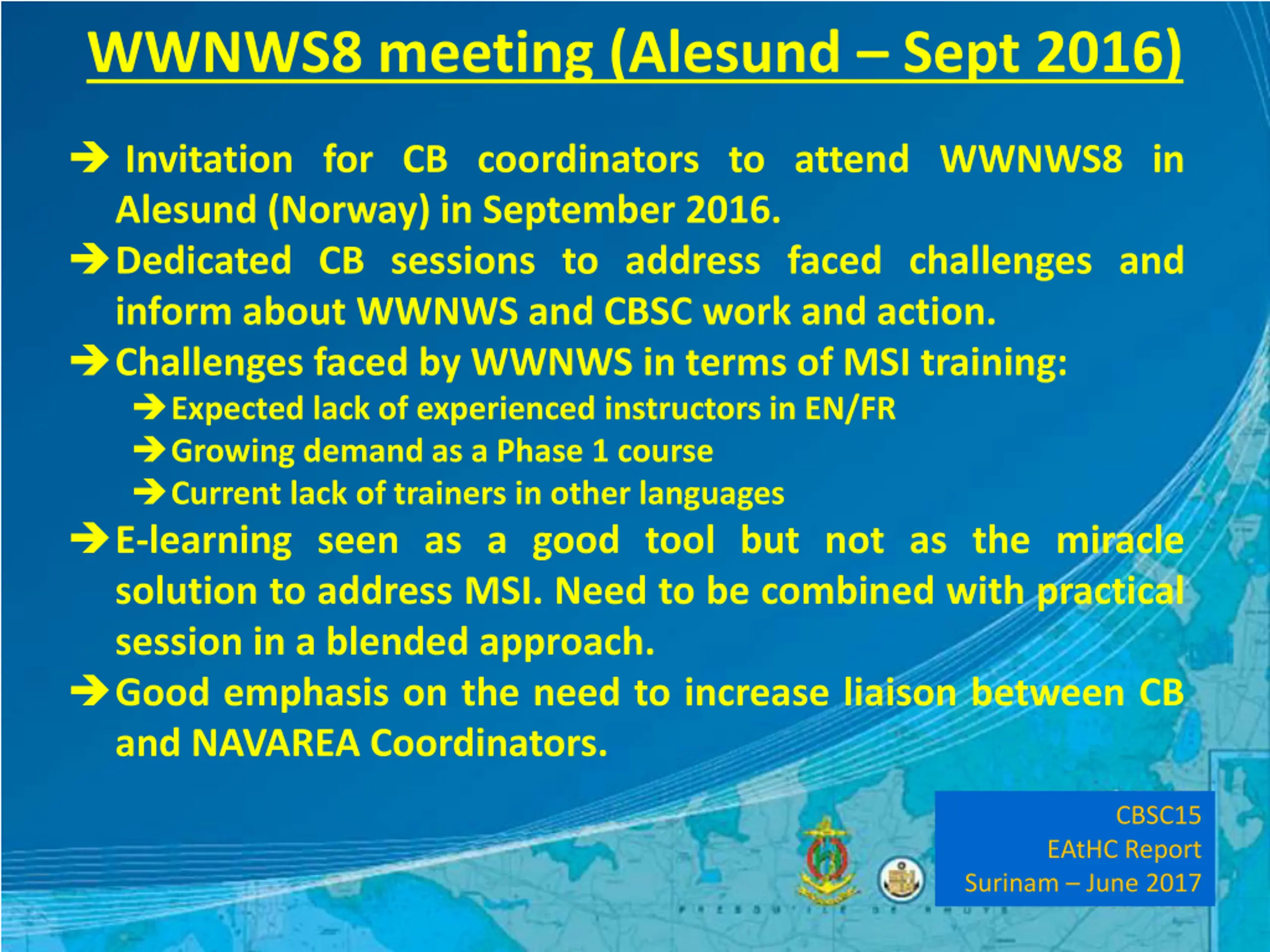 WWNWS8 meeting (Alesund Sept 2016) Invitation for CB coordinators to attend WWNWS8 in Alesund (Norway) in September 2016. Dedicated CB sessions to address faced challenges and inform about WWNWS and CBSC work and action. Challenges faced by WWNWS in terms of MSI training: Expected lack of experienced instructors in EN/FR Growing demand as a Phase 1 course Current lack of trainers in other languages E-learning seen as a good tool but not as the miracle solution to address MSI. Need to be combined with practical session in a blended approach. Good emphasis on the need to increase liaison between CB and NAVAREA Coordinators. CBSC15 EAtHC Report Surinam June 2017