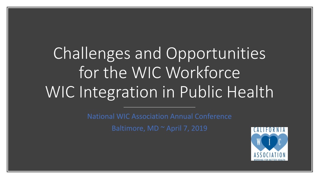 Challenges and Opportunities for the WIC Workforce WIC Integration in Public Health National WIC Association Annual Conference Baltimore, MD ~ April 7, 2019