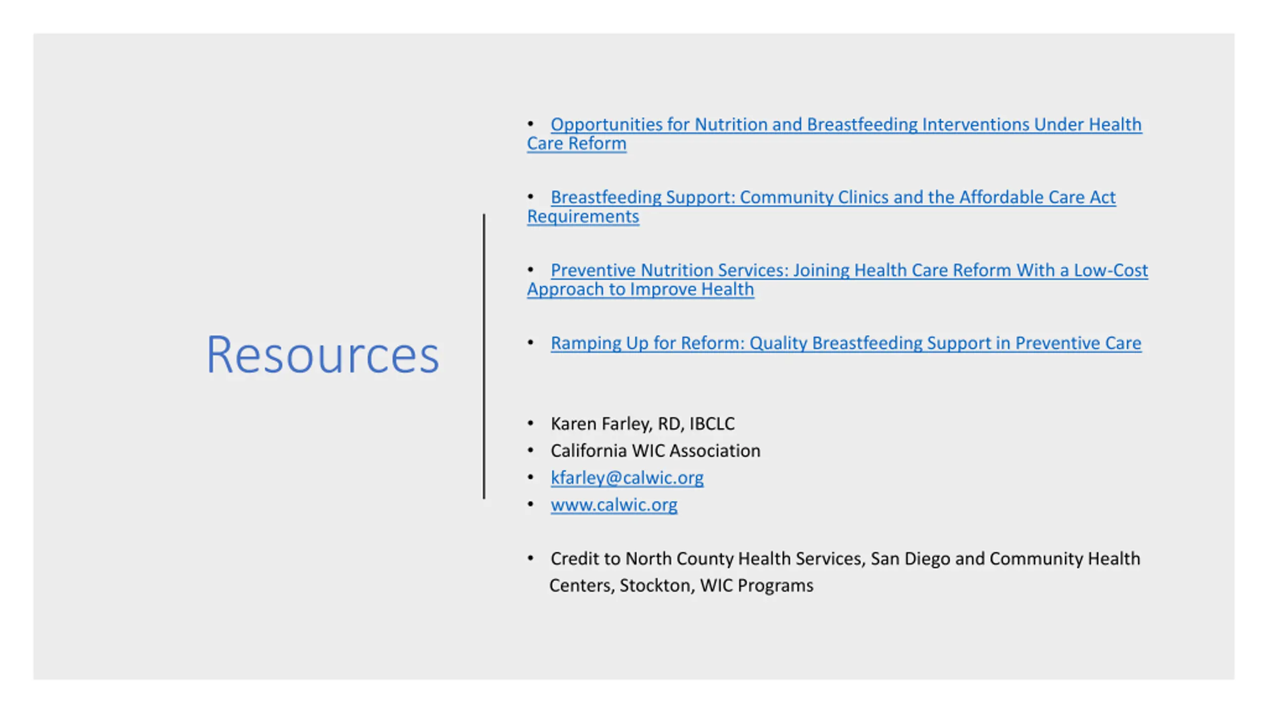 Opportunities for Nutrition and Breastfeeding Interventions Under Health Care Reform Breastfeeding Support: Community Clinics and the Affordable Care Act Requirements Preventive Nutrition Services: Joining Health Care Reform With a Low-Cost Approach to Improve Health Resources Ramping Up for Reform: Quality Breastfeeding Support in Preventive Care Karen Farley, RD, IBCLC California WIC Association kfarley@calwic.org www.calwic.org Credit to North County Health Services, San Diego and Community Health Centers, Stockton, WIC Programs