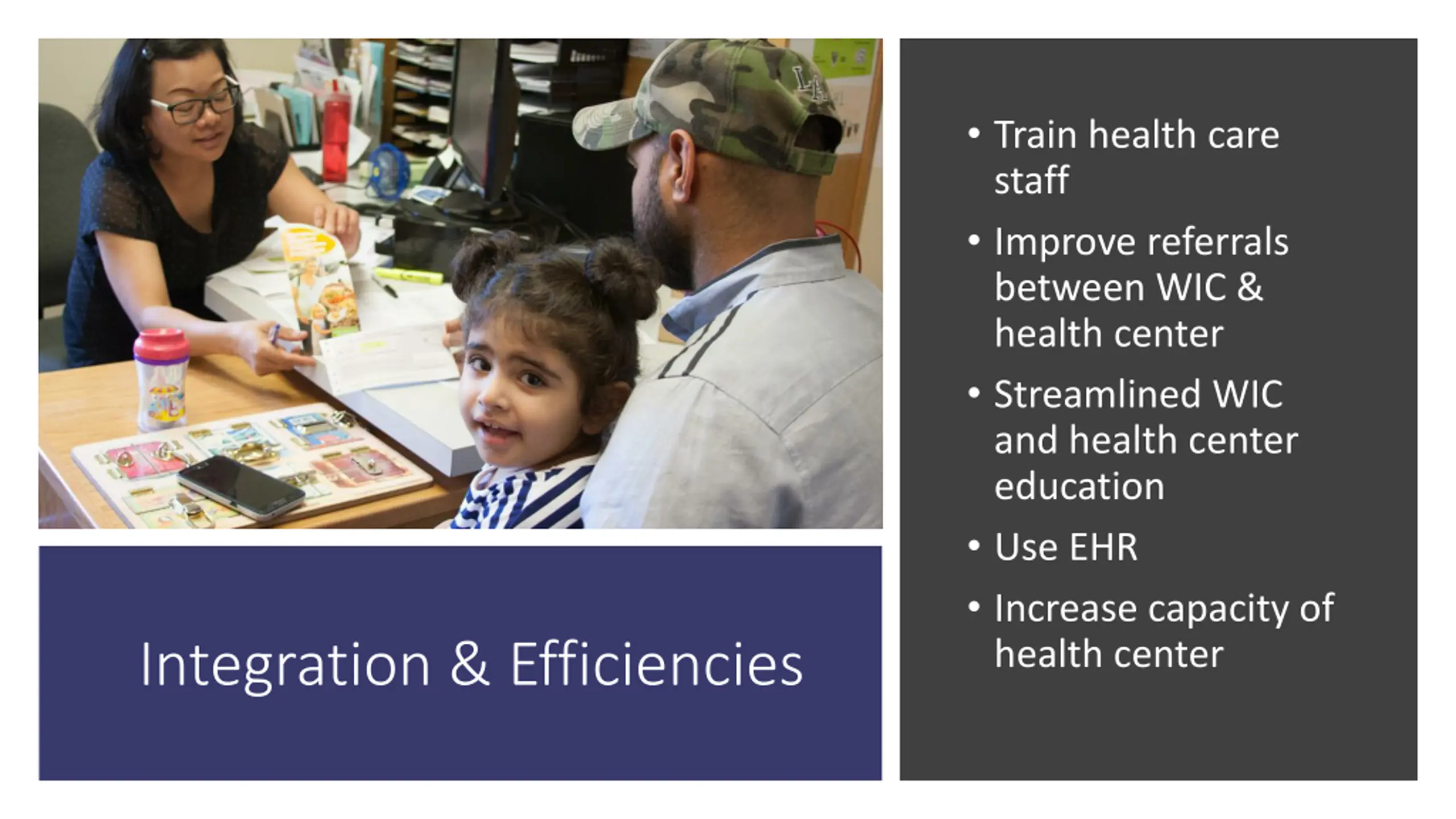 Train health care staff Improve referrals between WIC & health center Streamlined WIC and health center education Use EHR Increase capacity of health center Integration & Efficiencies