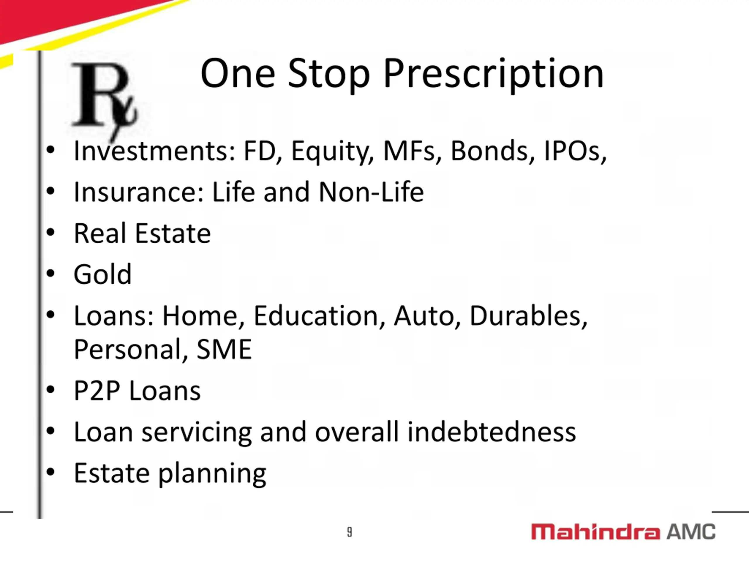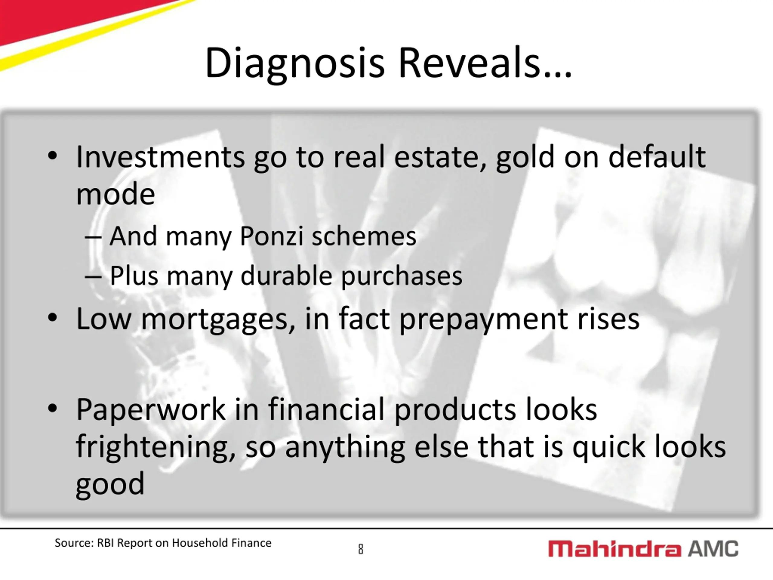 Diagnosis Reveals Investments go to real estate, gold on default mode And many Ponzi schemes Plus many durable purchases Low mortgages, in fact prepayment rises Paperwork in financial products looks frightening, so anything else that is quick looks good Source: RBI Report on Household Finance 8