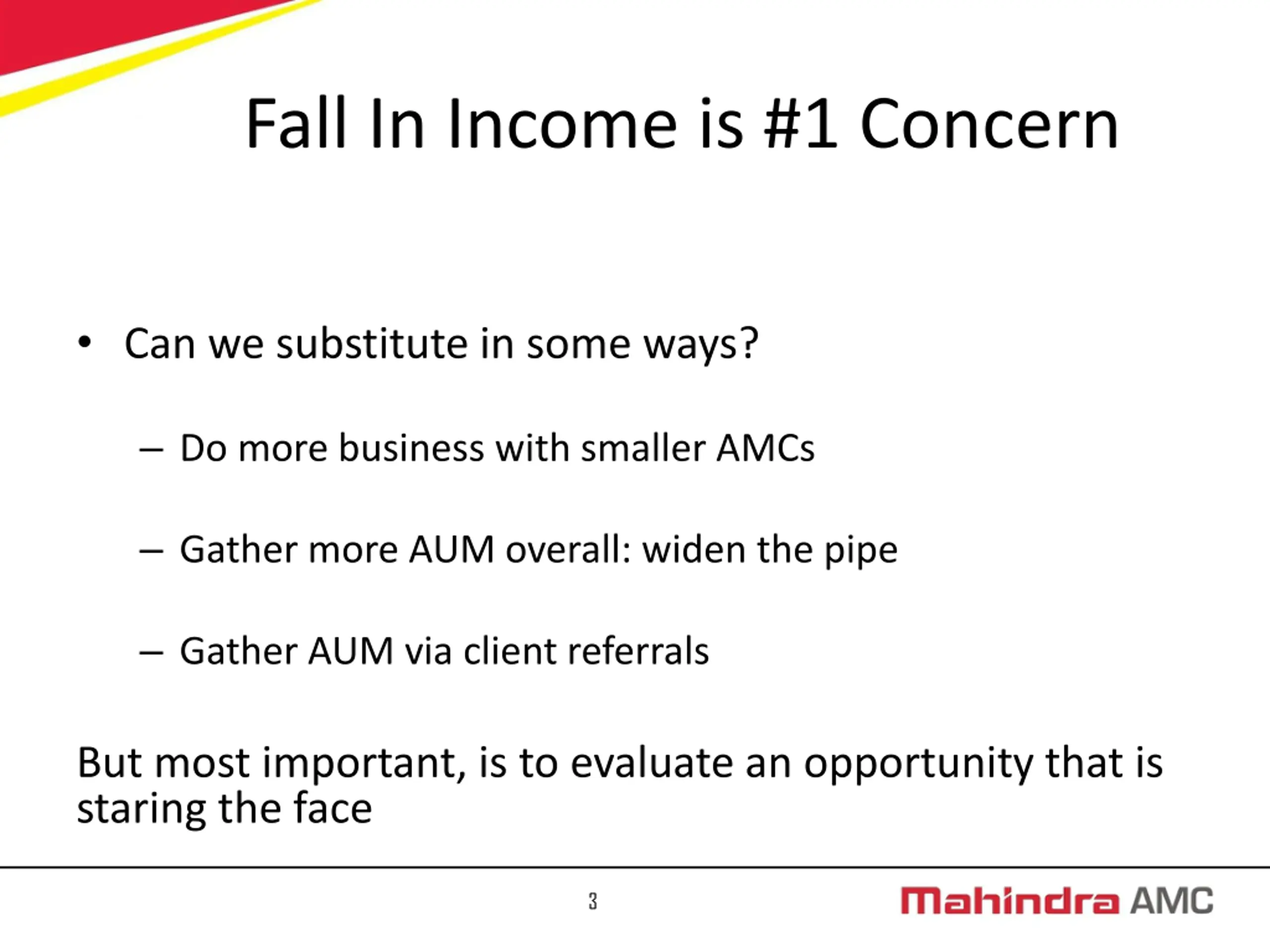 Fall In Income is #1 Concern Can we substitute in some ways? Do more business with smaller AMCs Gather more AUM overall: widen the pipe Gather AUM via client referrals But most important, is to evaluate an opportunity that is staring the face 3
