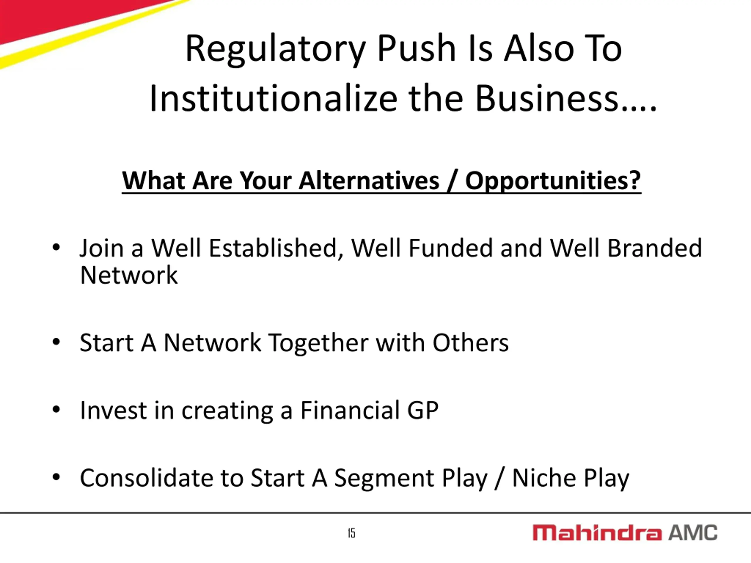 Regulatory Push Is Also To Institutionalize the Business . What Are Your Alternatives / Opportunities? Join a Well Established, Well Funded and Well Branded Network Start A Network Together with Others Invest in creating a Financial GP Consolidate to Start A Segment Play / Niche Play 15