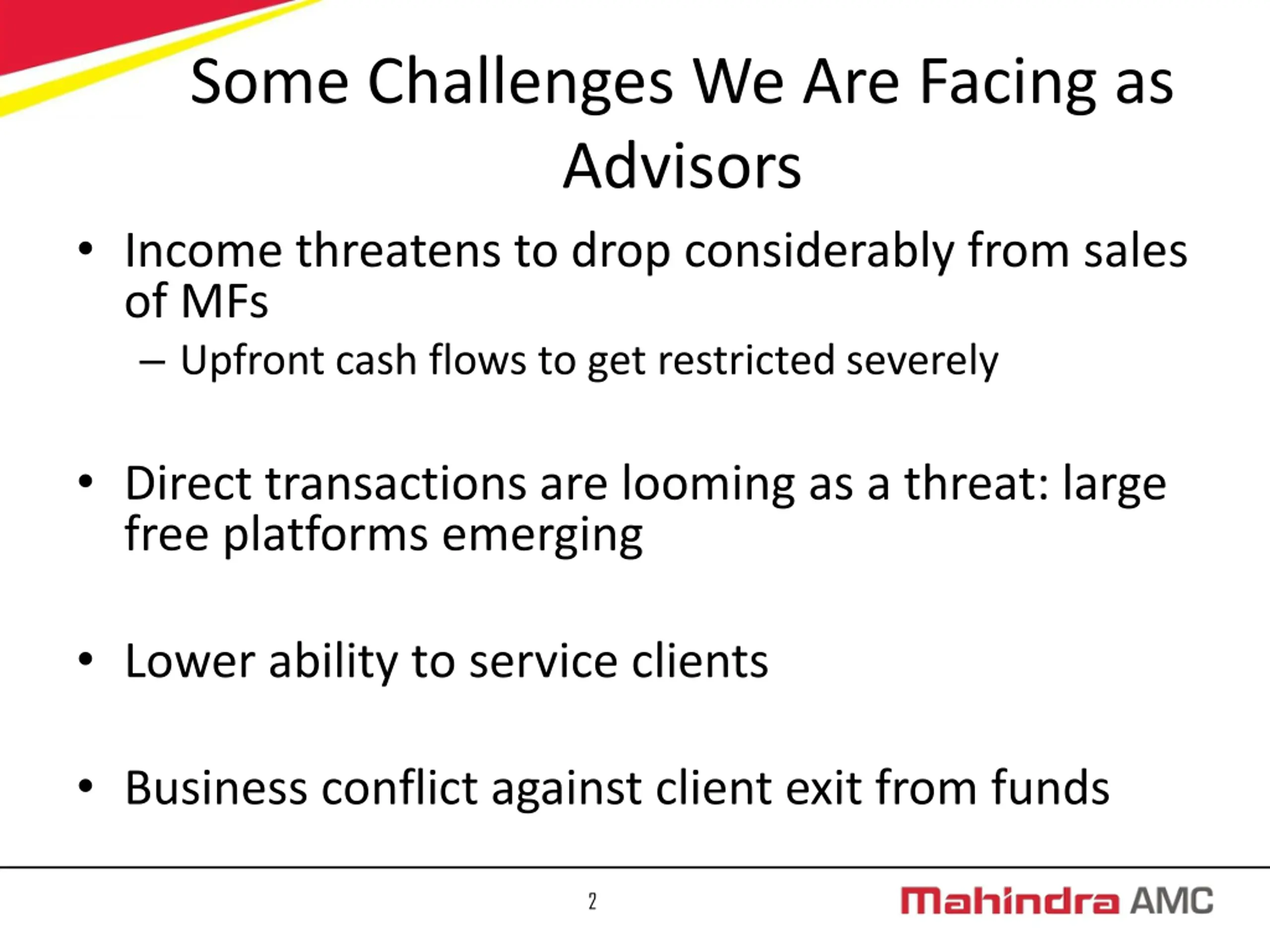 Some Challenges We Are Facing as Advisors Income threatens to drop considerably from sales of MFs Upfront cash flows to get restricted severely Direct transactions are looming as a threat: large free platforms emerging Lower ability to service clients Business conflict against client exit from funds 2