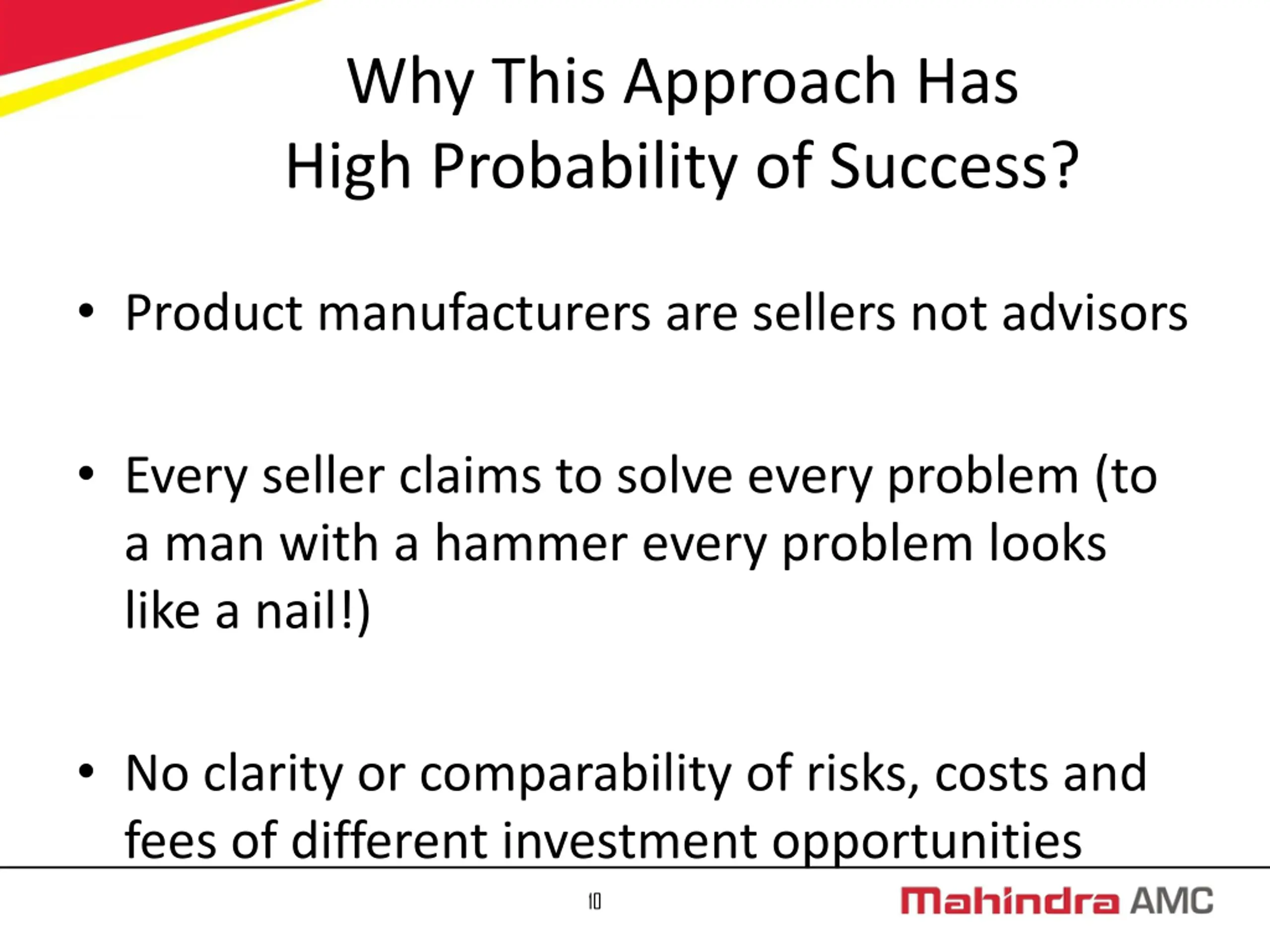 Why This Approach Has High Probability of Success? Product manufacturers are sellers not advisors Every seller claims to solve every problem (to a man with a hammer every problem looks like a nail!) No clarity or comparability of risks, costs and fees of different investment opportunities 10
