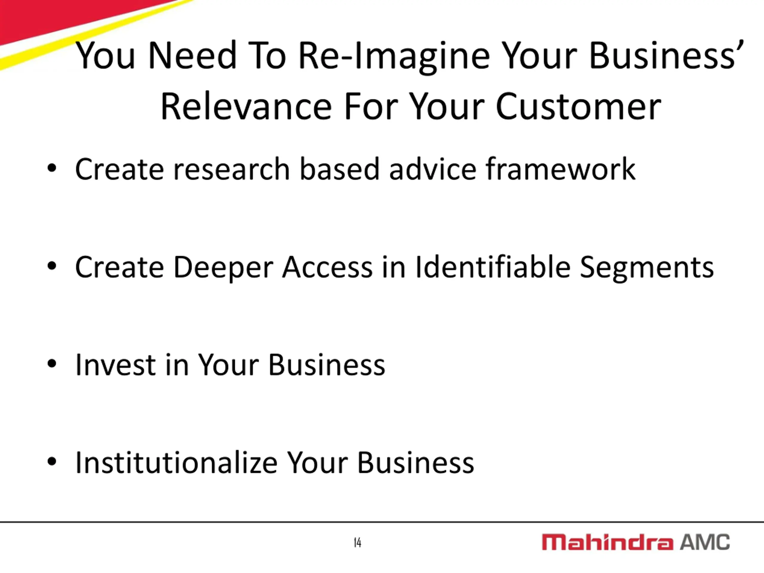 You Need To Re-Imagine Your Business Relevance For Your Customer Create research based advice framework Create Deeper Access in Identifiable Segments Invest in Your Business Institutionalize Your Business 14
