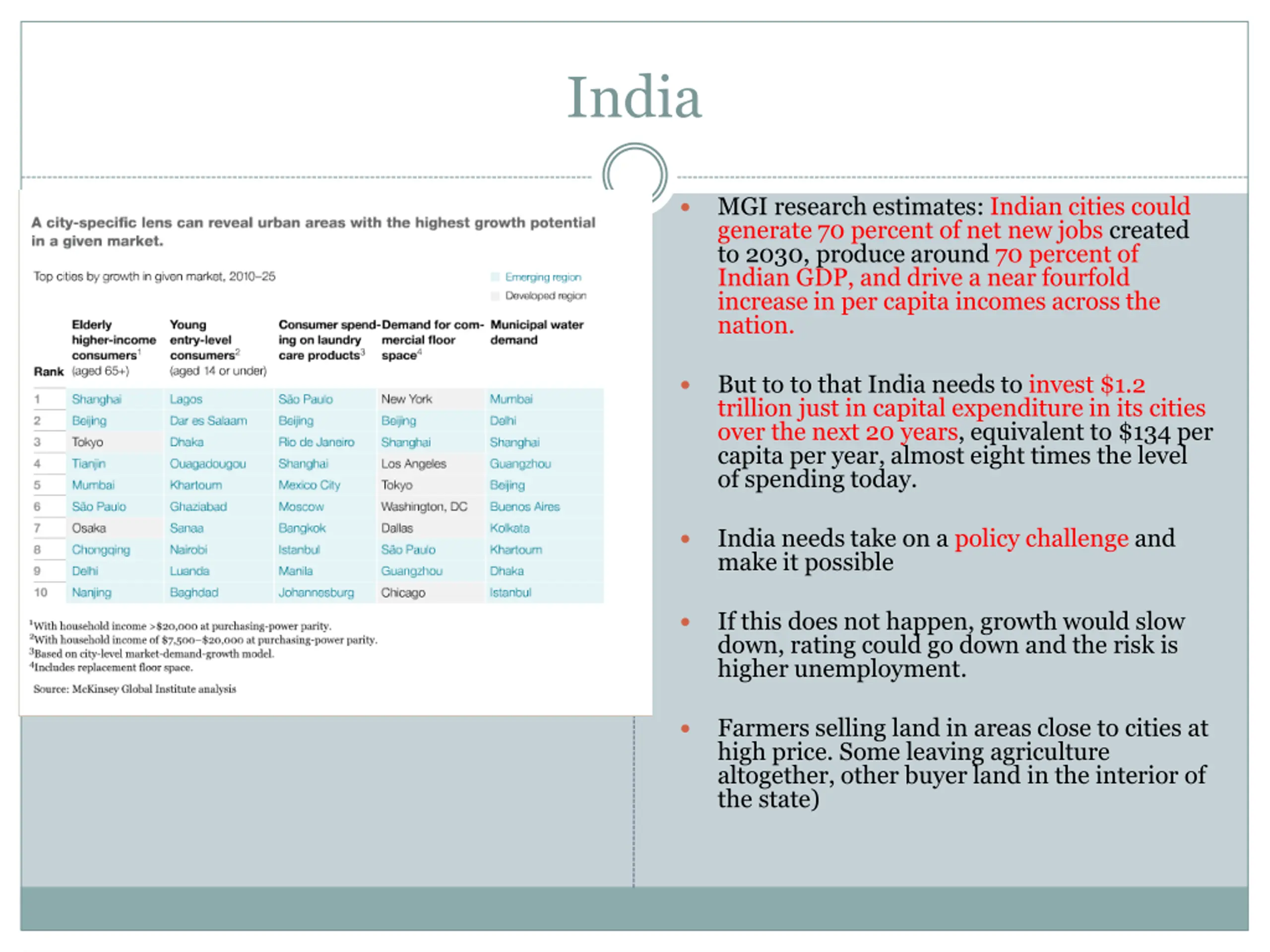 India MGI research estimates: Indian cities could generate 70 percent of net new jobs created to 2030, produce around 70 percent of Indian GDP, and drive a near fourfold increase in per capita incomes across the nation. But to to that India needs to invest $1.2 trillion just in capital expenditure in its cities over the next 20 years, equivalent to $134 per capita per year, almost eight times the level of spending today. India needs take on a policy challenge and make it possible If this does not happen, growth would slow down, rating could go down and the risk is higher unemployment. Farmers selling land in areas close to cities at high price. Some leaving agriculture altogether, other buyer land in the interior of the state)