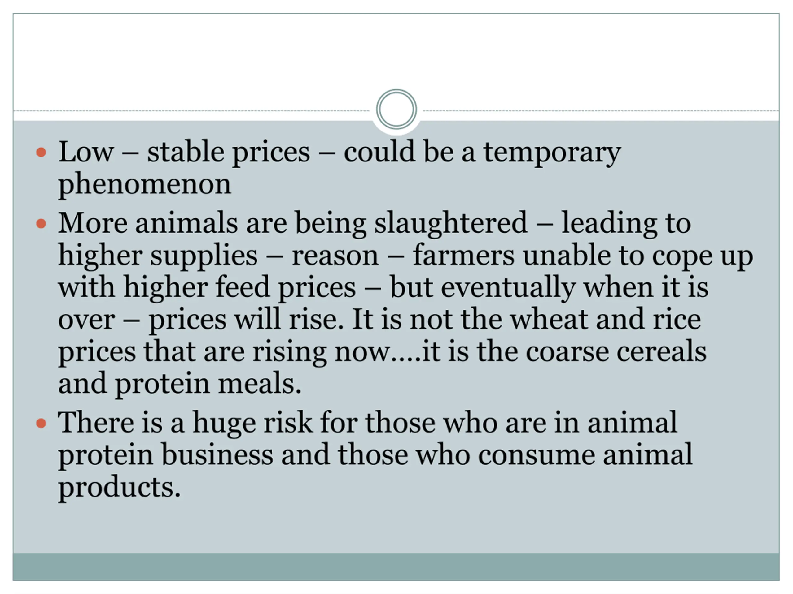 Low stable prices could be a temporary phenomenon More animals are being slaughtered leading to higher supplies reason farmers unable to cope up with higher feed prices but eventually when it is over prices will rise. It is not the wheat and rice prices that are rising now .it is the coarse cereals and protein meals. There is a huge risk for those who are in animal protein business and those who consume animal products.