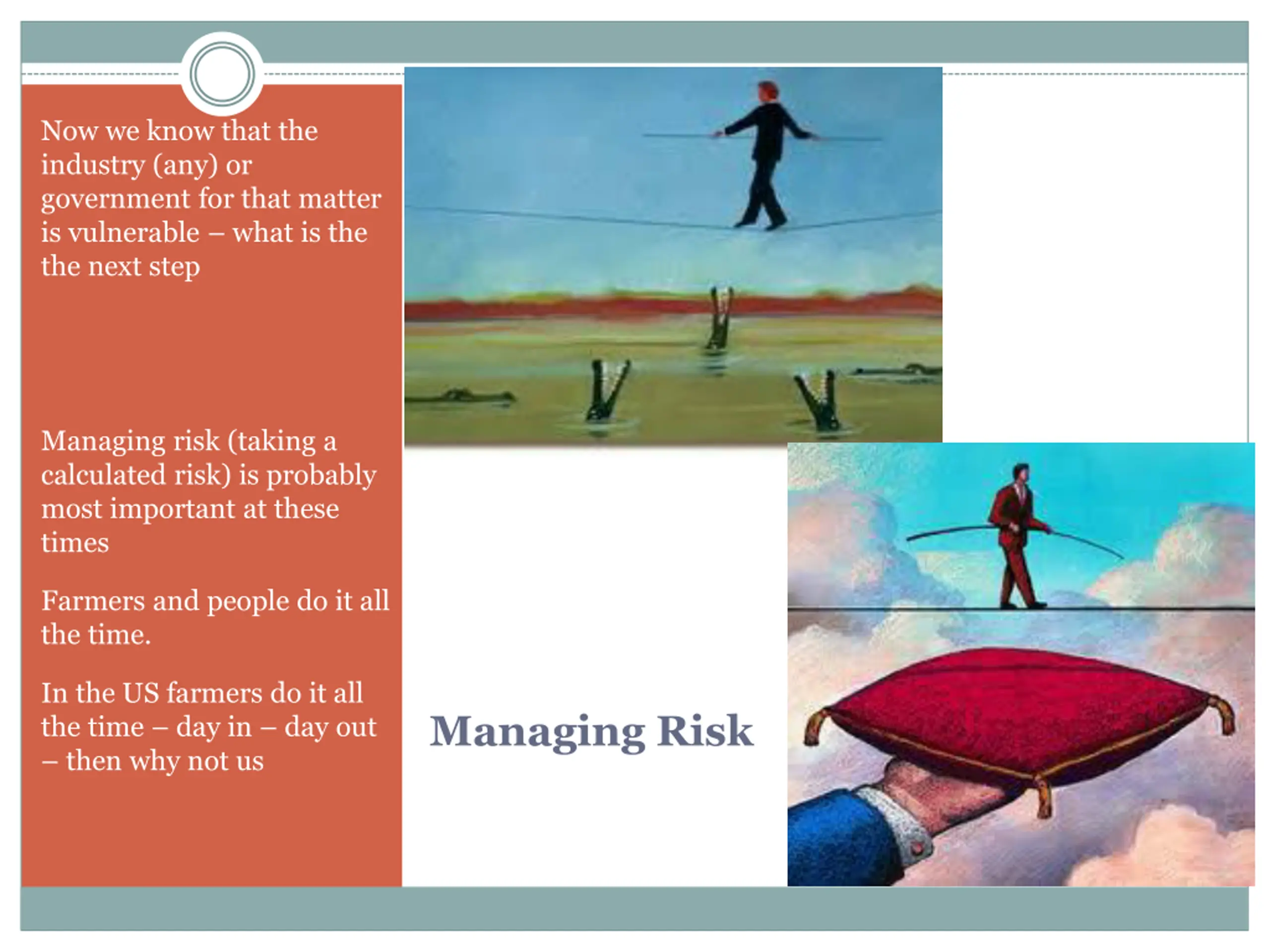 Now we know that the industry (any) or government for that matter is vulnerable what is the the next step Managing risk (taking a calculated risk) is probably most important at these times Farmers and people do it all the time. In the US farmers do it all the time day in day out then why not us Managing Risk